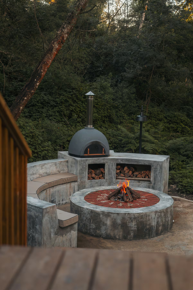 Step outside to a covered patio complete with a built-in braai and a wood-fired hot tub, perfect for starlit evenings. A firepit and a rustic pizza oven add to the charm of outdoor living.