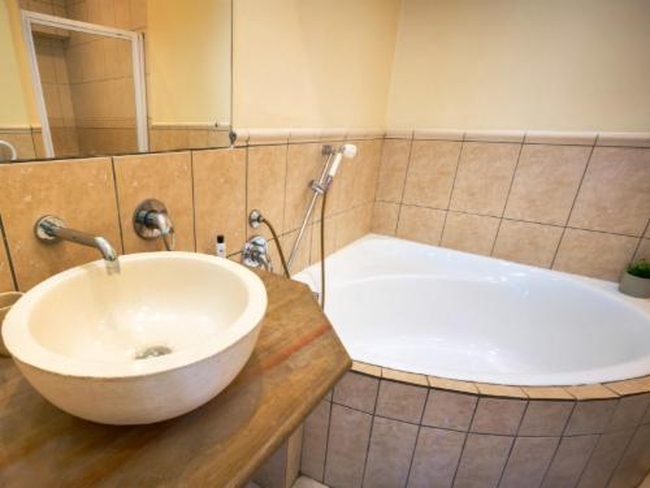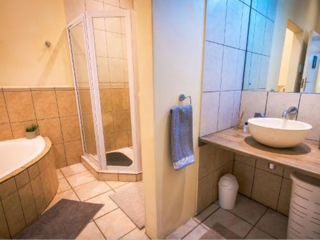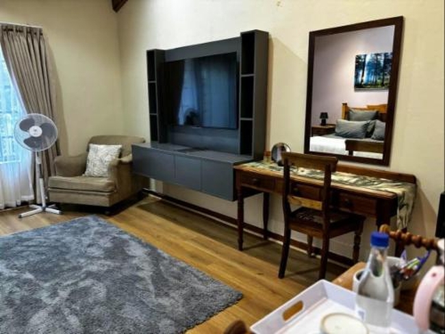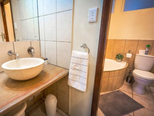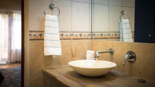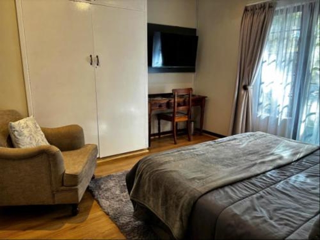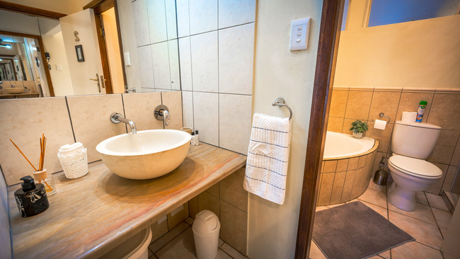 This comfortable bedroom accommodates two guests and includes a double bed, a single couch, and a desk. The en-suite bathroom is equipped with both a bath and shower, along with a hairdryer, toiletries, and bathrobes. For added convenience, the room offers a wall-mounted TV, complimentary Wi-Fi, and tea and coffee-making facilities. Additional features include Wi-Fi, a television with DSTV/satellite channels, a sitting area, a personal safe, and a fan. Guests can also enjoy scenic garden views. The bathroom provides a separate tub and shower, a hairdryer, bathrobes, and tea and coffee provisions for a relaxing stay.
