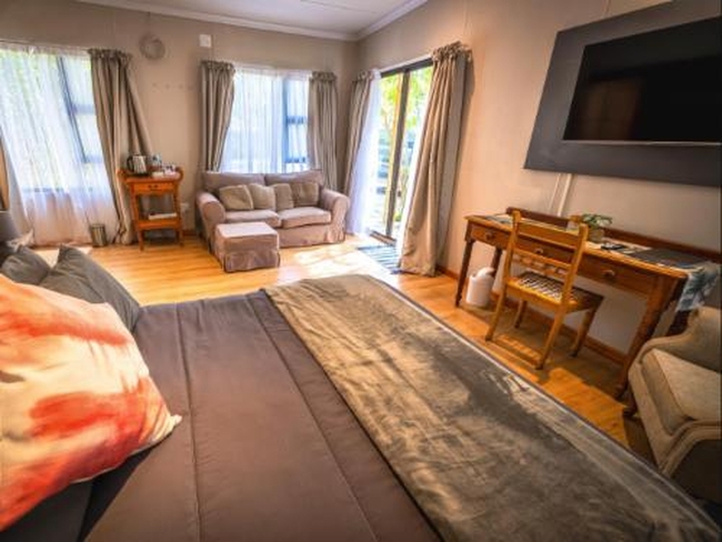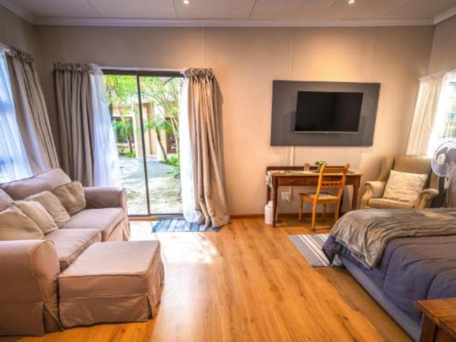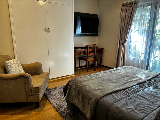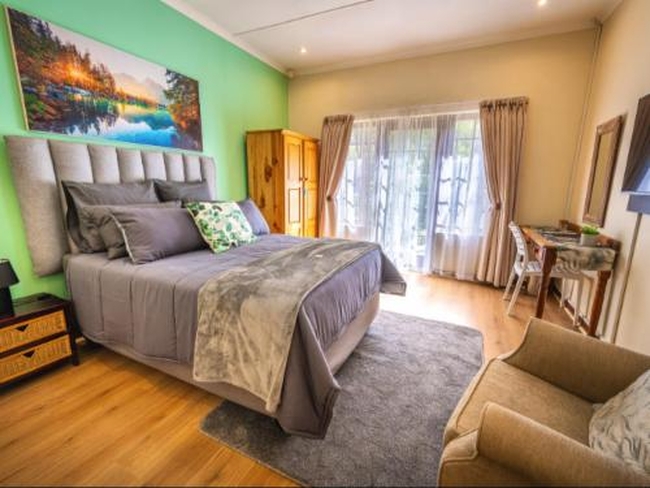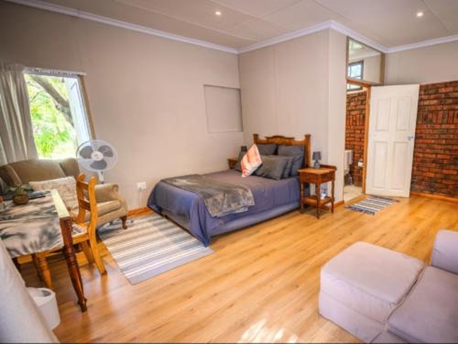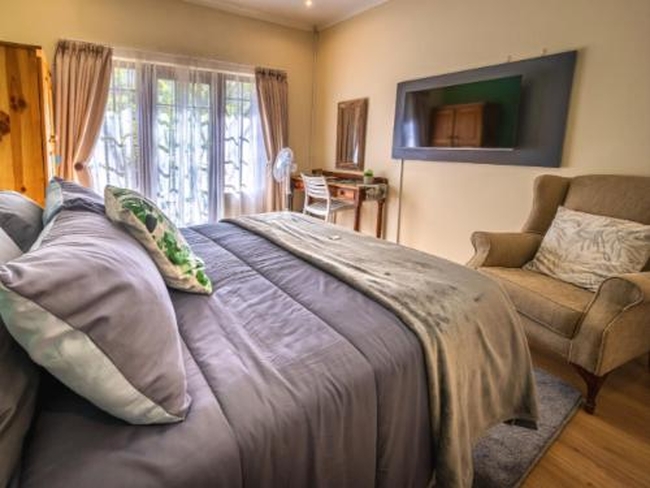 This spacious bedroom, ideal for two guests, includes a king-sized bed, a cosy couch, and direct access to the garden. The room is equipped with a flat-screen TV, complimentary Wi-Fi, and tea and coffee-making facilities. The en-suite bathroom features both a bath and shower, along with toiletries and bathrobes for your comfort. Additional amenities include Wi-Fi, a television with DSTV/satellite channels, a comfortable sitting area, a desk, a personal safe, and both a ceiling fan and regular fan. Guests can enjoy peaceful garden views, while the en-suite bathroom offers a separate tub and shower, a hairdryer, bathrobes, and coffee and tea provisions.