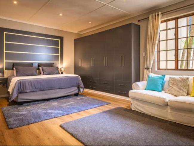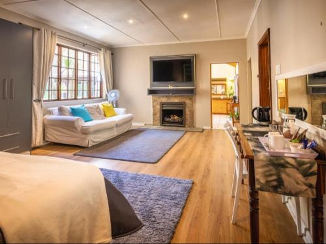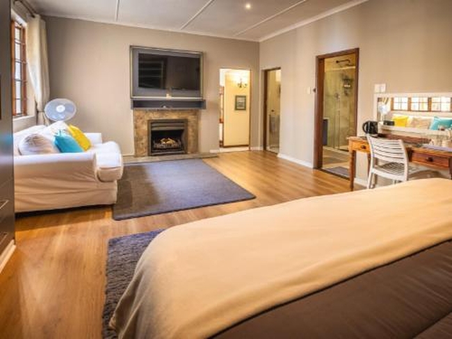 This generously sized bedroom, offering views of the pool, accommodates two guests and features a king-sized bed, a two-seater couch, a flat-screen television, and complimentary Wi-Fi. It also provides tea and coffee-making facilities, as well as an en-suite bathroom equipped with a shower, bathrobes, toiletries, and direct access to the pool area. The room is fully equipped with modern conveniences, including Wi-Fi, a television with DSTV/satellite channels, a comfortable sitting area, a desk, a personal safe, and a fireplace. Additional features include a ceiling fan and scenic views of the garden and pool. The bathroom is fitted with a shower, a hairdryer, bathrobes, and coffee and tea-making facilities for your comfort.