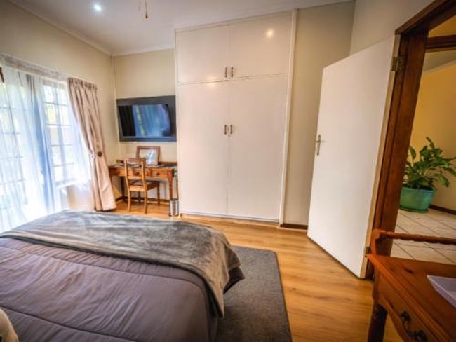 This inviting room, perfect for two guests, offers a queen-sized bed and a desk, along with an en-suite bathroom featuring both a bath and shower, complemented by a hairdryer, toiletries, and bathrobes. Guests can enjoy modern comforts such as a wall-mounted television, complimentary Wi-Fi, and tea and coffee-making facilities. The room is fully equipped with Wi-Fi, a television with DSTV/satellite channels, a personal safe, and a ceiling fan. It also boasts lovely views of the garden. The en-suite bathroom includes a separate bath and shower, a hairdryer, bathrobes, and tea and coffee provisions for your convenience.