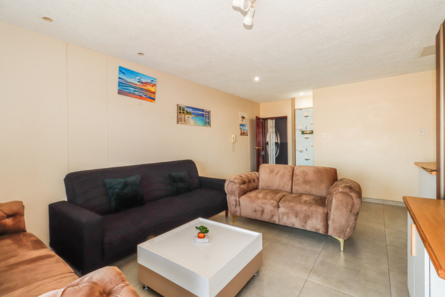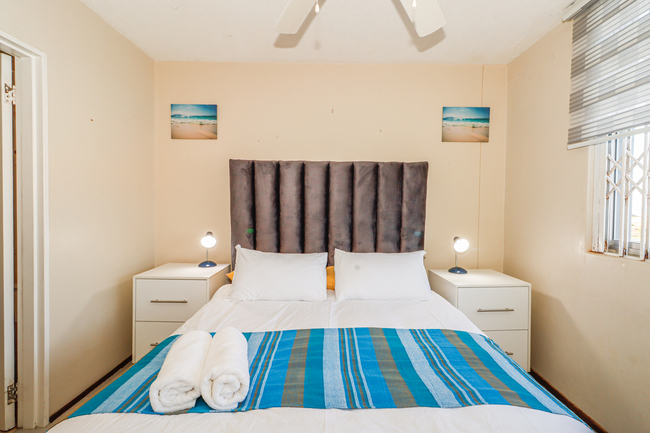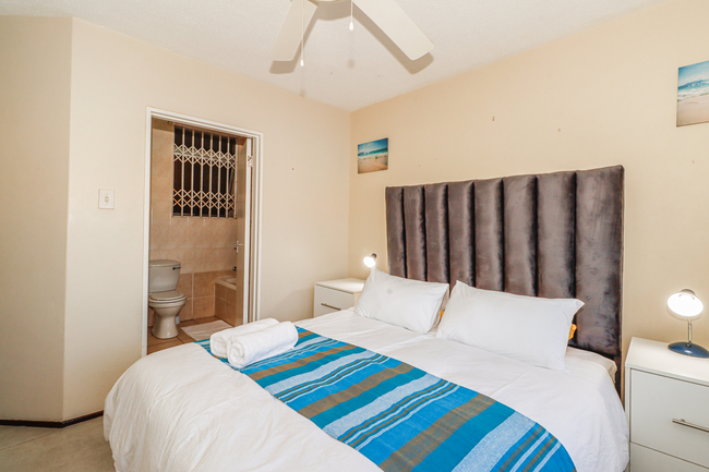 A television with DStv connectivity is available for entertainment. From the living area, doors lead to a covered patio that overlooks a private garden, an ideal space for morning coffee or quiet conversation. Margate Boulevard ensures peace of mind with controlled access security and provides convenient on-site parking for guests.