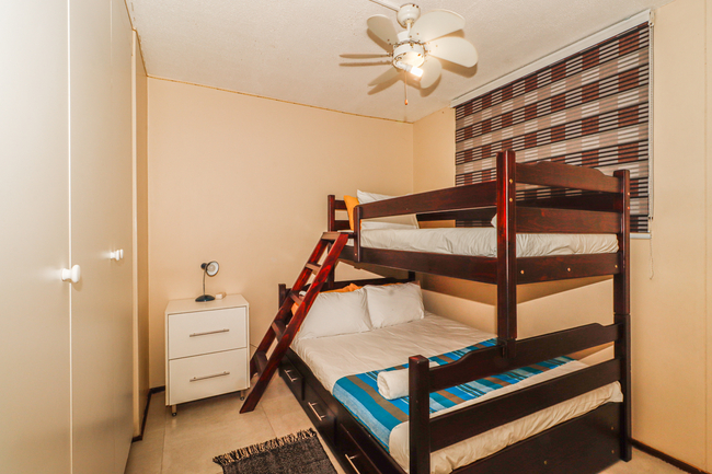 The second bedroom features a tri-bunk bed, perfect for children or teens, while the third bedroom offers two single beds. These rooms share access to a second bathroom that includes a bathtub. Quality linen is provided for all guests.