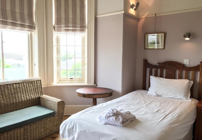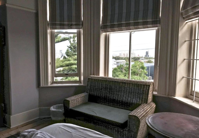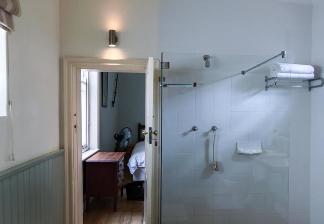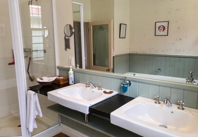 Braeside Apartment is located on the first floor and has four meter high wooden ceilings and pine flooring. There are two bedrooms that each have twin beds and an en-suite bathroom with a bath, shower, basins and either a heated towel rail or under-floor heating. The master bedroom has a Victorian fireplace as well as a big, antique style ceiling fans which provides ample cooling during hot weather. The second bedroom has a free-standing fan. Bed linen and bathroom towels are provided.