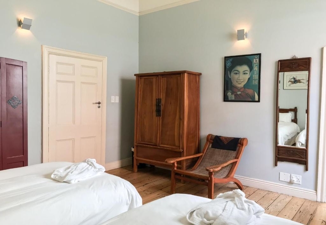This apartment is located on the first floor and has four meter high wooden ceilings and pine flooring. There are two bedrooms that each have twin beds and its own en-suite bathroom (with a bath, shower, basins and either a heated towel rail or under-floor heating). The master bedroom has a Victorian fireplace as well as a big, antique style ceiling fans which provides ample cooling during hot weather. The second bedroom has a free-standing fan. Bed linen and bathroom towels are provided. The living room is comfortably furnished and includes a flat-screen TV with DStv. There is a walk-in dressing room off the living area. The kitchen is fully equipped and contains an oven, fridge / freezer, stove, oven, toaster, fridge / freezer, microwave, tea / coffee making facilities, dishwasher and a breakfast counter with seating for four guests. The separate scullery features a washing machine as well as a tumble dryer. There is a ten seater dining table for guests to enjoy their meals. The secure courtyard has a dining area that seats up to six guests and makes use of BBQ / braai facilities. Guests are able to make use of the off-street parking.