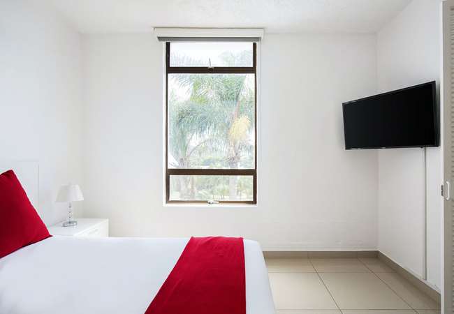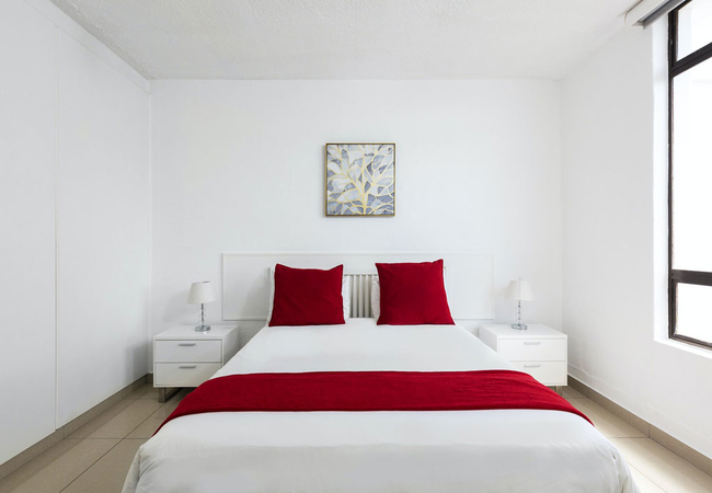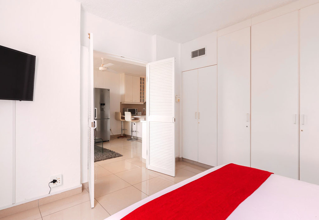 Breakers 421 is a self catering apartment with air conditioning and two bedrooms. The main bedroom has a double bed and a TV and the second bedroom has a tri-bunk which has a double bed at the bottom and a single on top. The bathroom has a shower over the bath.