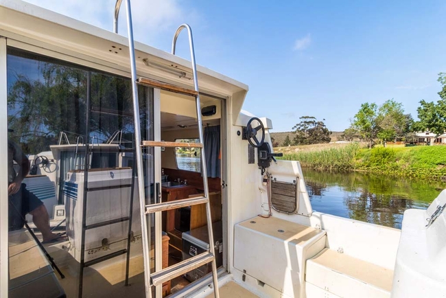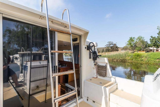 The sliding door opens to an outdoor cockpit area, perfect for fishing or relaxing in the sun. Additionally, the rooftop deck is ideal for sunbathing or bird watching.