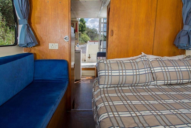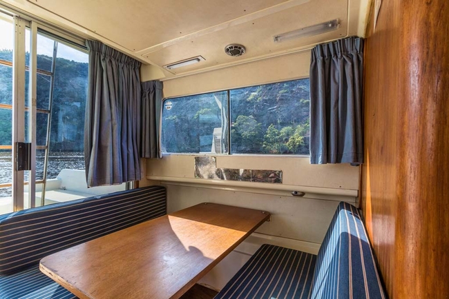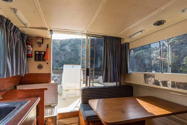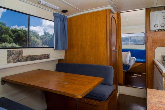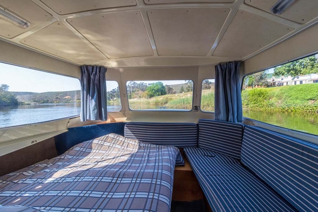 The houseboat comfortably accommodates up to five guests, making it ideal for a couple or a small family. The fore cabin, separated from the main area by a sliding door, provides privacy and features a double bed along with a bench that can be used as a child's bed with storage underneath.