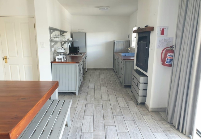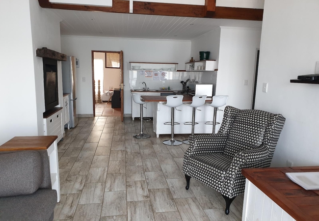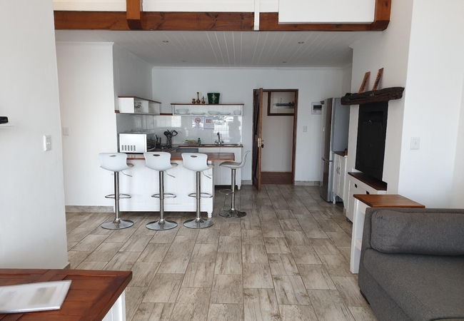 Although this unit has no view, the interior makes up for that. There are two bedrooms downstairs and a third bathroom outside. all rooms are furnished with a King-size be or twin beds. There are three bathrooms with either a bath / shower, toilet and basin. The kitchen area forms part of an open plan living area with the lounge. There is a perfect view of the Breede River from your deck.