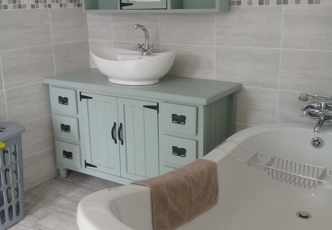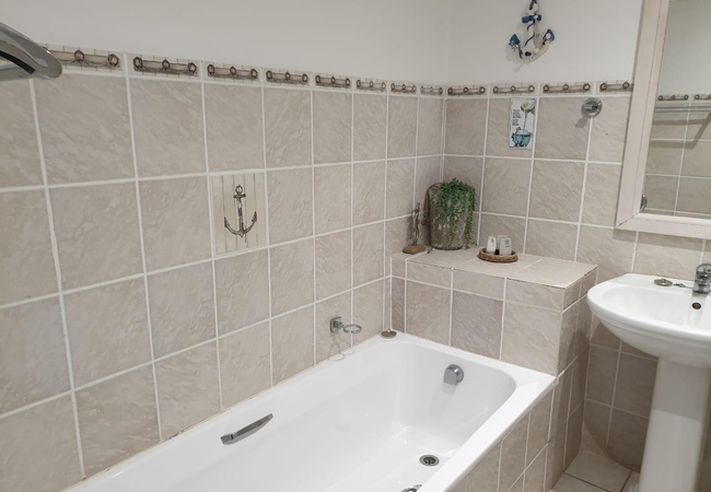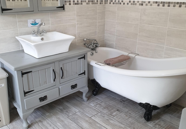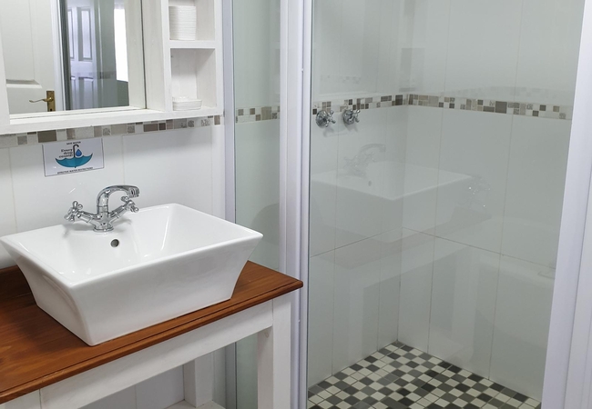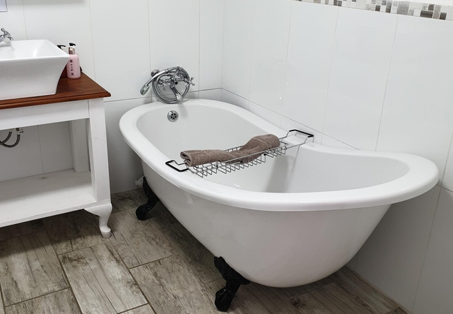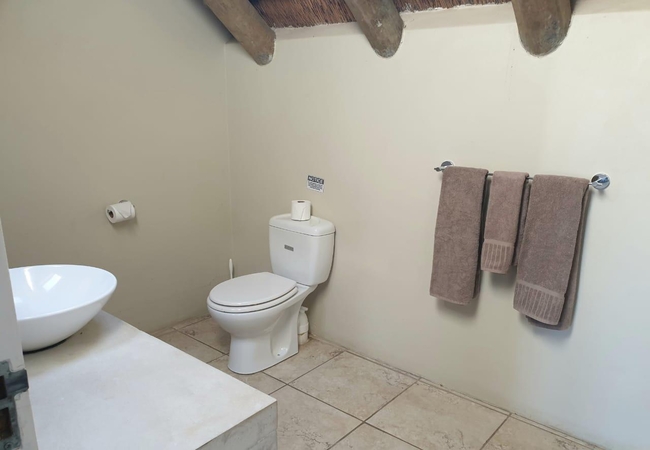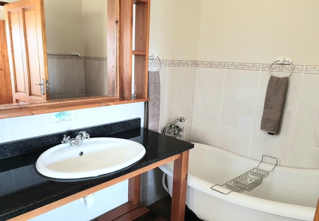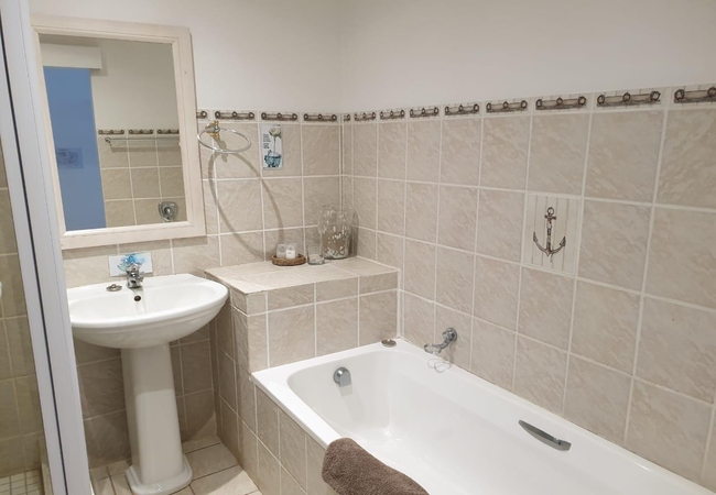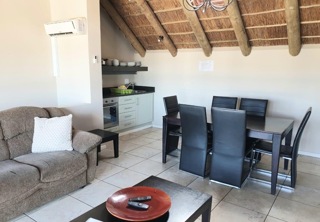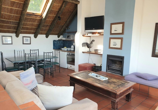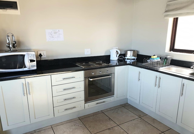 This luxury two bedroom self catering unit has a bedroom downstairs furnished with a King-size bed and another bedroom upstairs in the loft with two single beds. One bathroom is fitted with a bath, toilet and basin and the other is fitted with a shower, toilet and basin. There is a well equipped kitchenette and an indoor braai.