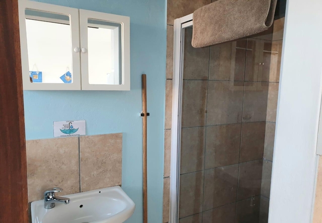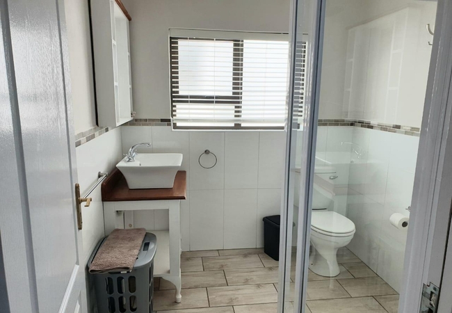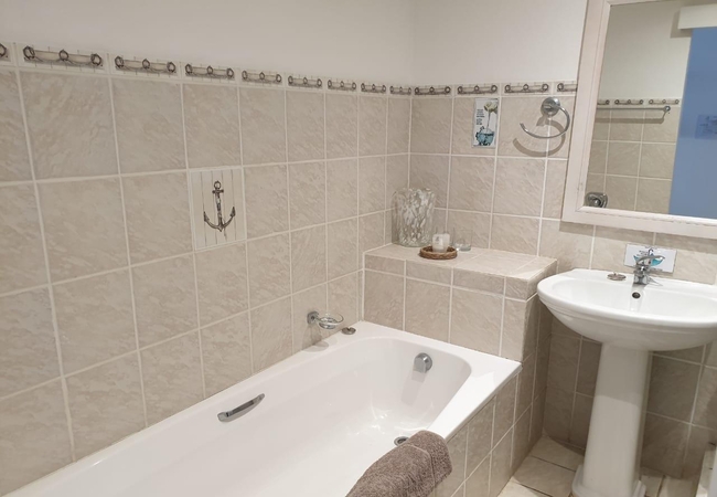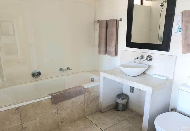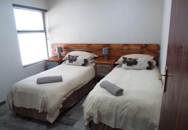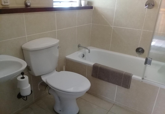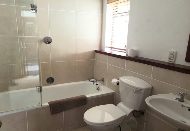 This luxury two bedroom self catering unit has a bedroom furnished with a King-size bed and another bedroom with two single beds. One bathroom is fitted with a bath, toilet and basin and the other is fitted with a shower, toilet and basin. There is a well equipped kitchenette and an indoor braai.