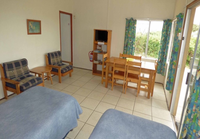 Each cottage has either a double bed or 2 single beds in the main bedroom, a double bunk for children in the second bedroom and 2 single beds in the lounge / dining area. The kitchen is extremely well equipped including double door fridge / freezer + microwave and a gas stove with oven.