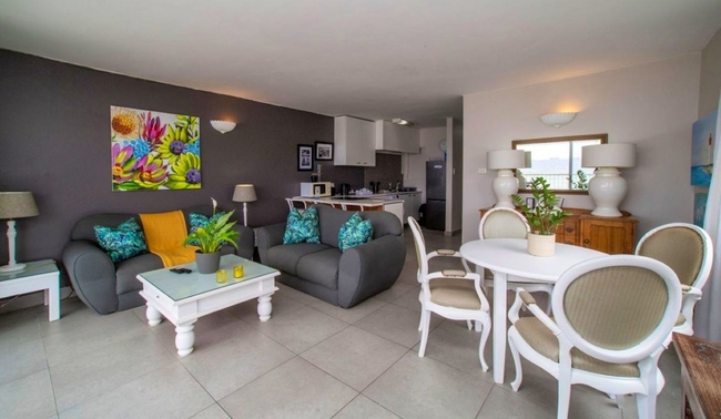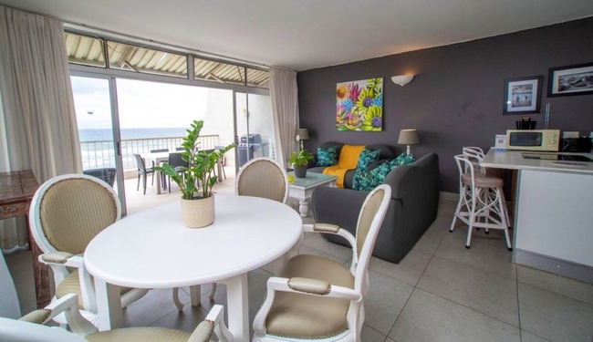 The apartment features a balcony with outdoor furniture and views of the beach below. Guests have access to braai facilities and secure parking.