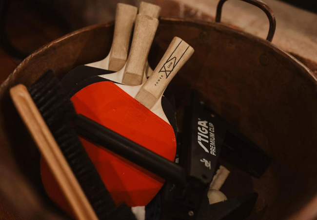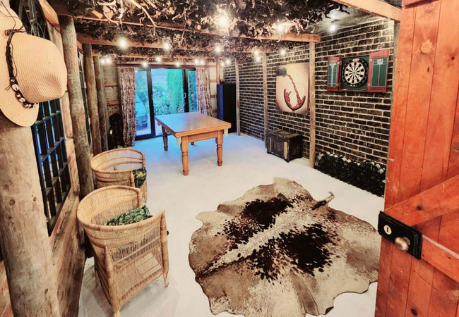 The games room has a bar area with a wood-fired hot tub and a pizza oven.