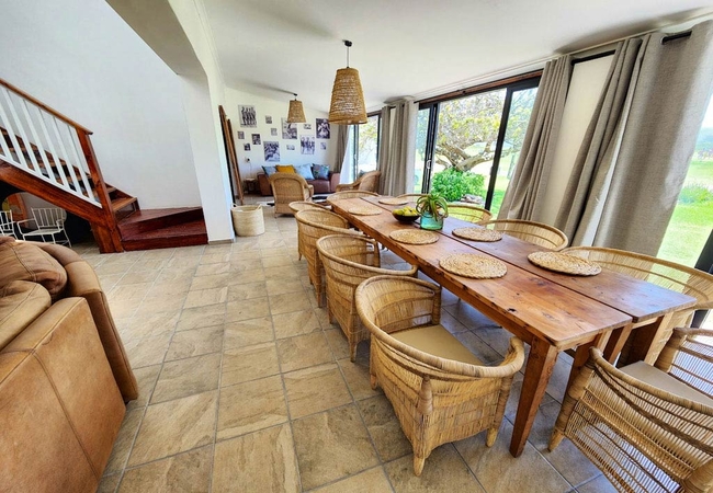 Buff and Fellow by the Bay is a villa in Great Brak that sleeps eight guests. There is one main bedroom downstairs that is furnished with a Queen-size bed and has an en-suite bathroom.
