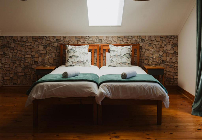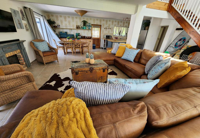 Buff and Fellow by the Bay sleeps eight guests. There is one main bedroom downstairs that is furnished with a Queen-size bed and has an en-suite bathroom. The other bedrooms are located upstairs. The second bedroom is furnished with a Queen-size bed and the third has four single beds. There is a separate bathroom shared by these two rooms. There is a fully equipped kitchen with a stove, microwave, and dishwasher. The unit has a laundry with a washer and dryer. There is an open plan living and dining area with an indoor fireplace and braai. The games room has a bar area with a wood-fired hot tub and a pizza oven. Canoes, boogie boards, and beach essentials are provided.