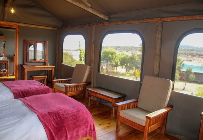 Situated next to reception with a large round stone fireplace in the middle, overlooking our 5 hectare dam with the Swartberg Mountain Range in the distance. TV and free Wi-Fi available. On arrival relax with a welcome drink while completing your registration card, while your guide takes your luggage to your luxury or superior tent.