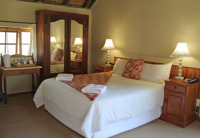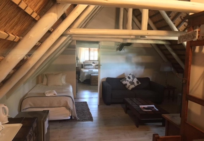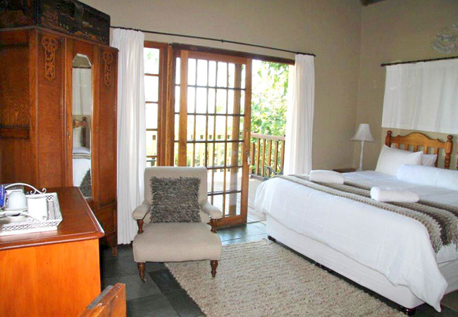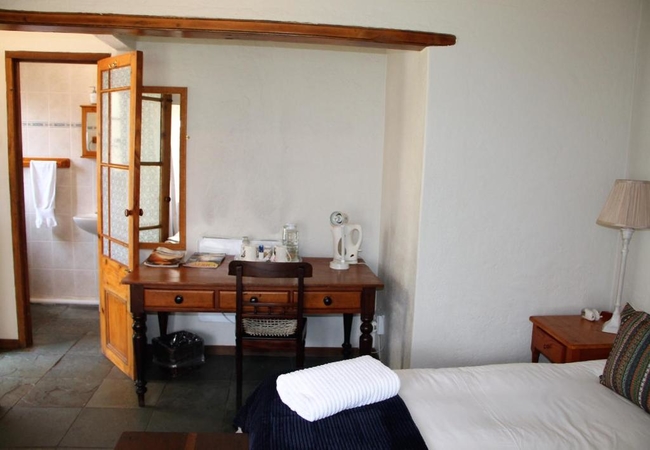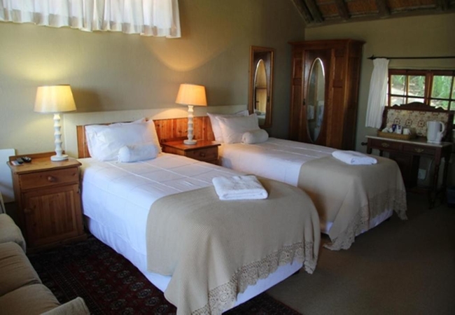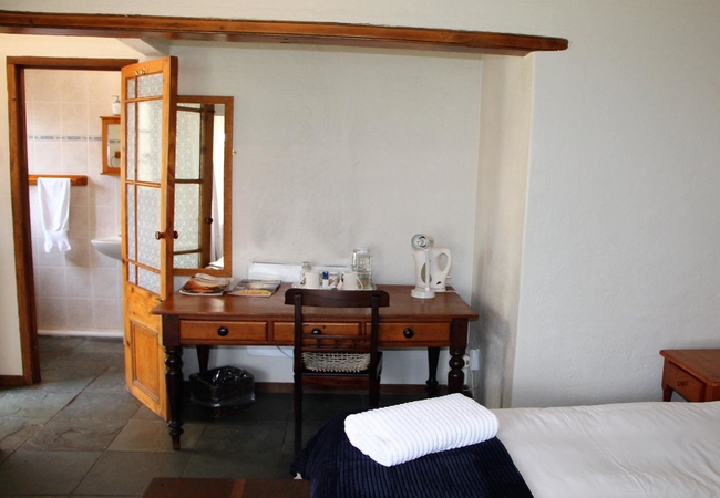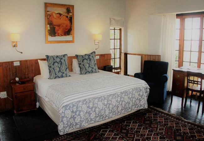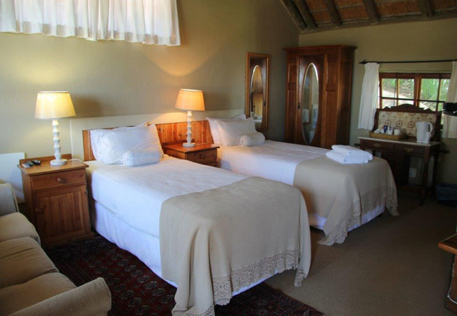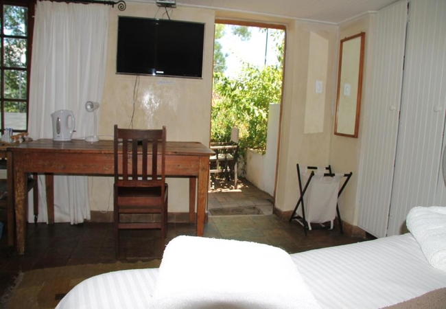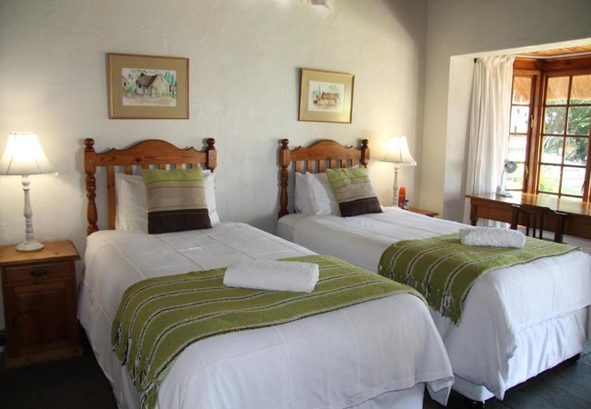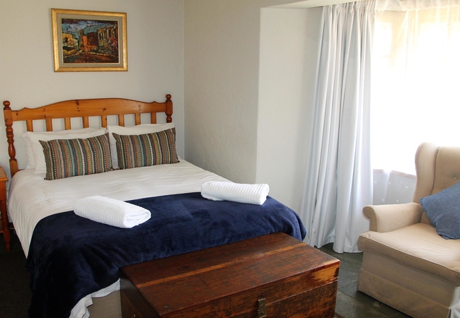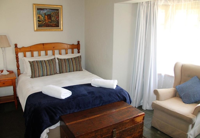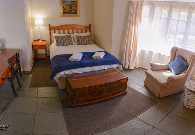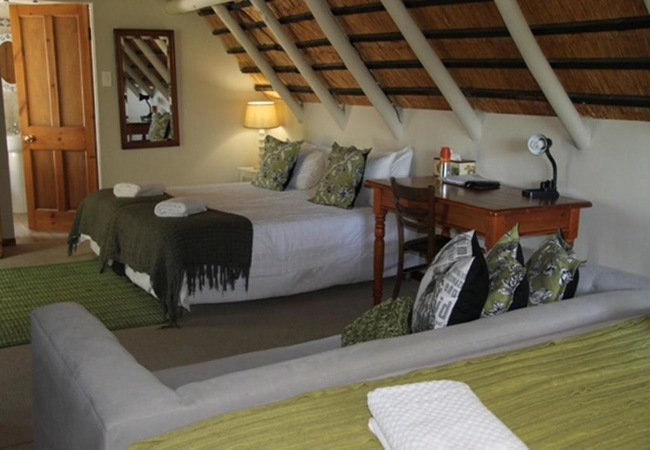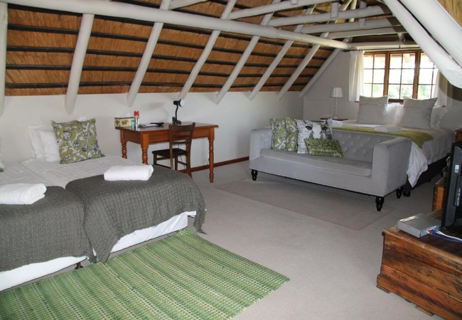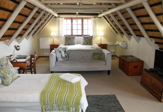 Accessed via a flight of stairs in the main building. Queen with 2 singles, Full bathroom en-suite. Flat screen Television DSTV, Wireless Internet Access, Electric Blanket, Airconditioner, Tea / Coffee facilities. Non-smoking. Our rooms are fitted with extra length, superior quality beds; free Wi-Fi service; flat screen TVs with DStv hotel bouquet; tea and coffee facilities; fans and heating.
