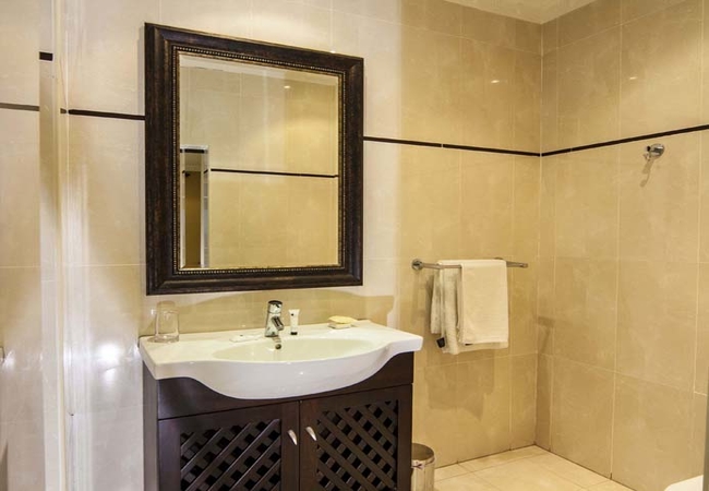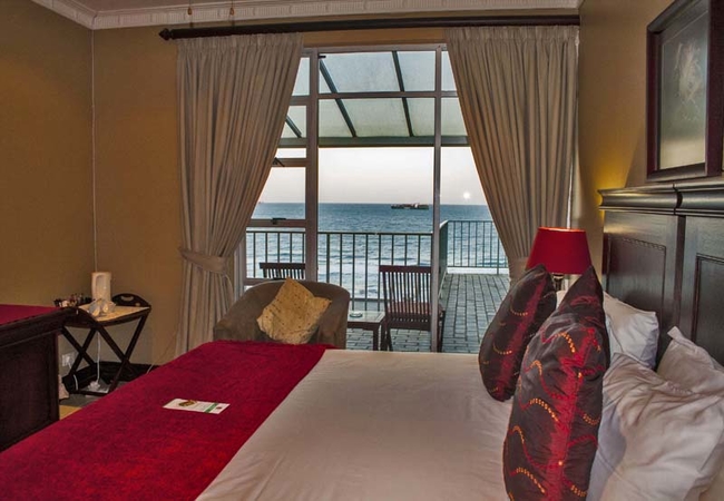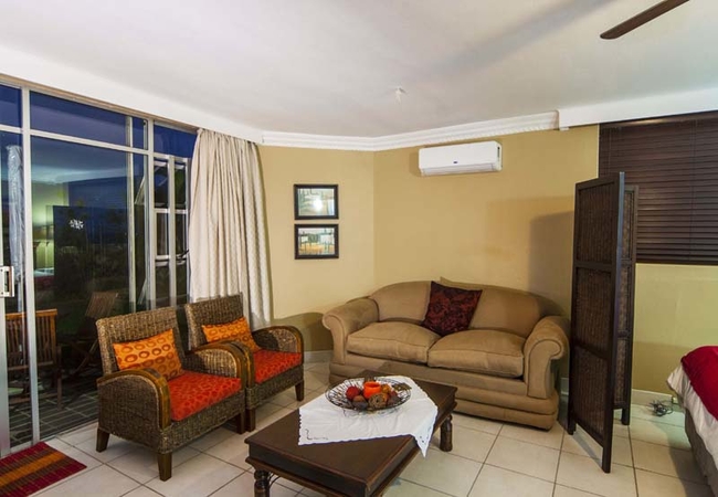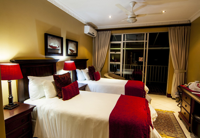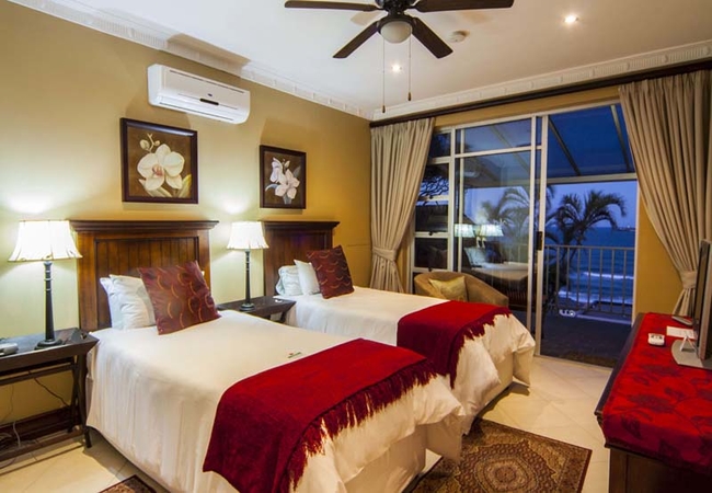 This sea facing room has twin beds (convertible to a King-size bed on request) and an en-suite bathroom with a shower. There is a fold out bed for child. The room has a private balcony, air-conditioning, tea / coffee facilities and a TV with DStv linked to the main decoder.