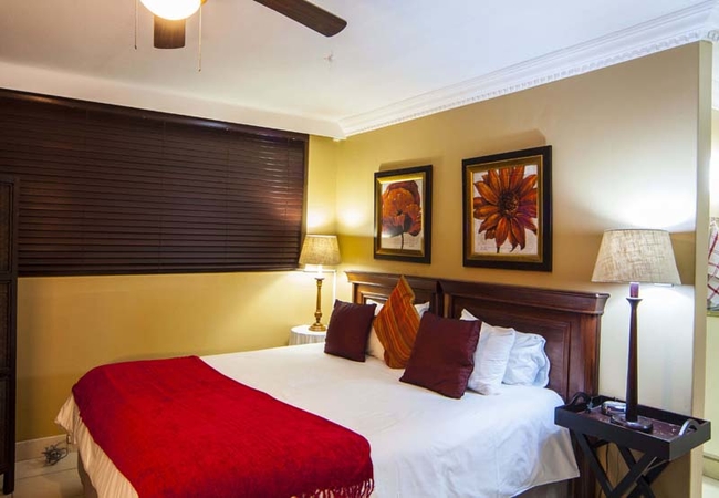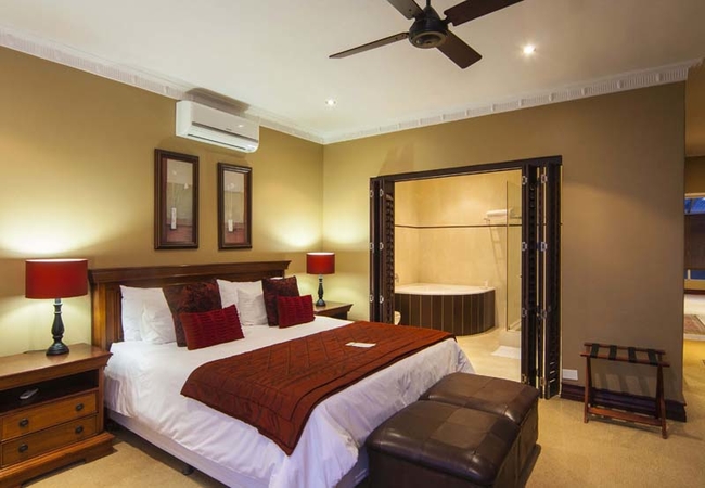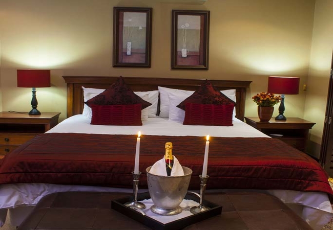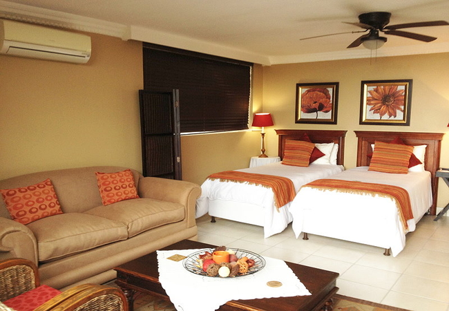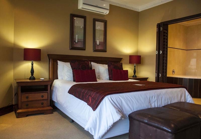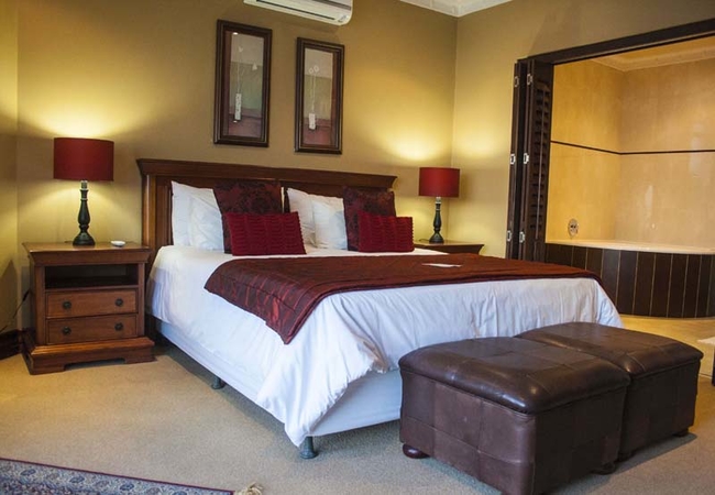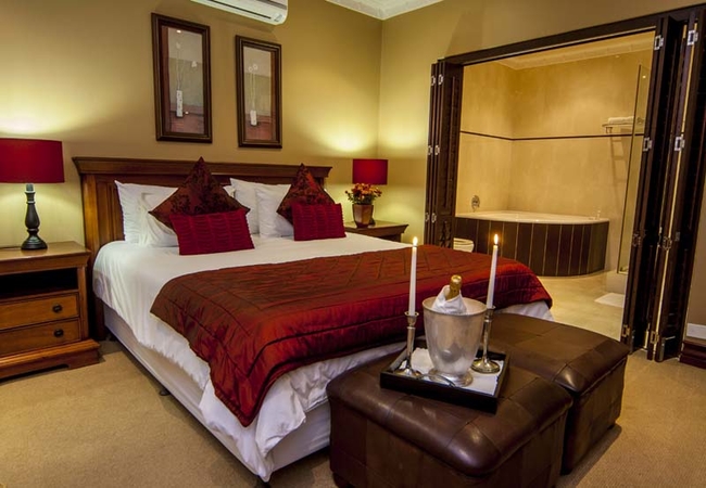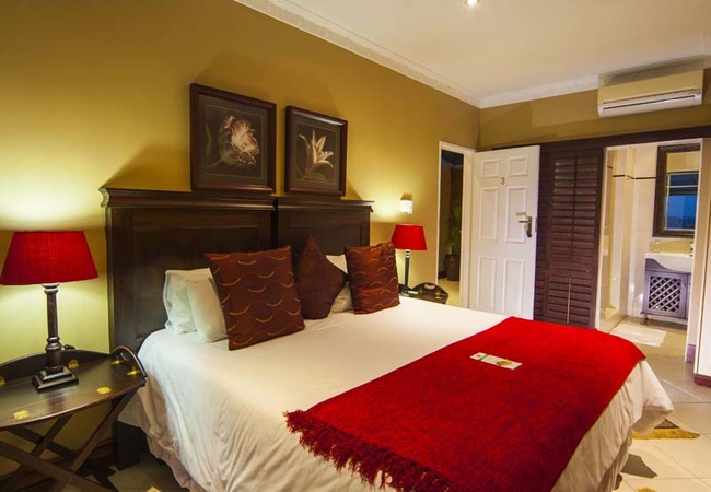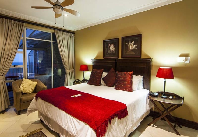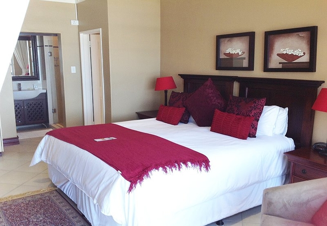 Spacious romantic room with King-size bed and an en-suite bathroom with a Jacuzzi bath and a large shower. There are beautiful sea views from the private balcony. The room has air-conditioning, tea / coffee facilities and TV with DStv linked to the main decoder.