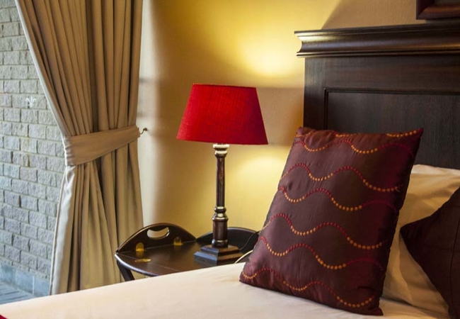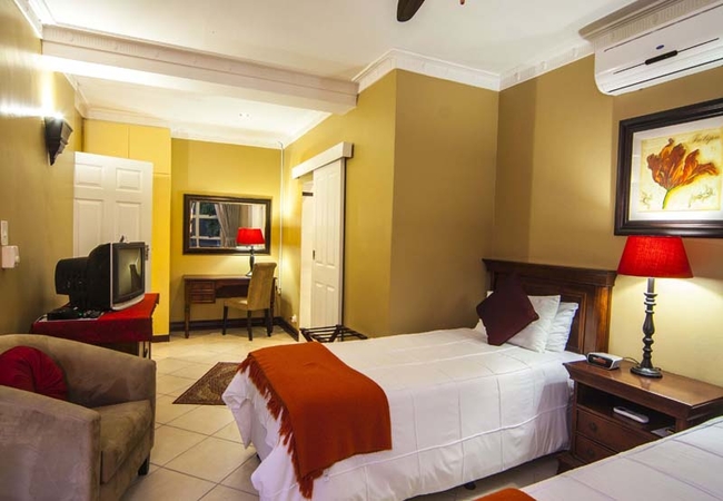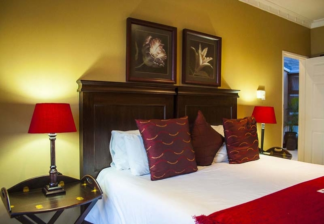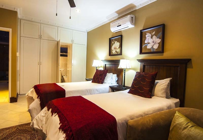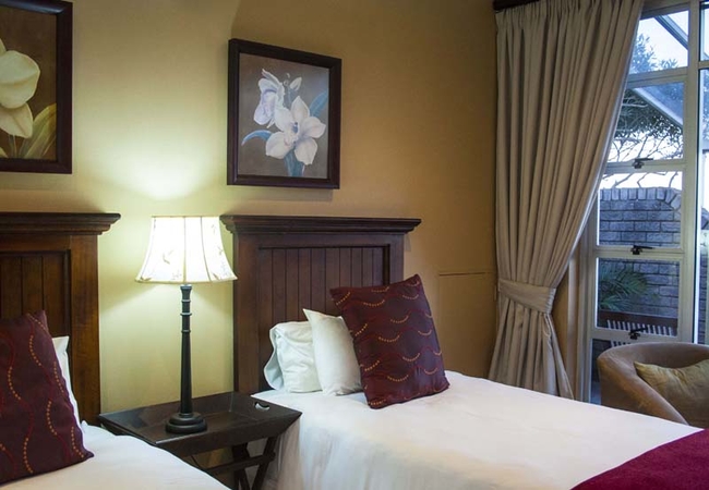 Room overlooking koi pond and garden. There are twin beds that are convertible to a King-size bed on request. There is a fold out bed for a child. The en-suite bathroom has a shower. The room has air-conditioning, tea / coffee facilities and TV with DStv linked to the main decoder.