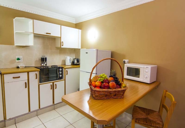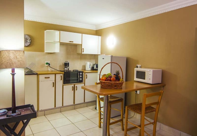 Garden apartment for families with children or up to two pets. The room has twin beds or a King-size bed and a double sleeper couch. There is an open plan kitchenette with a two plate stove, mini oven and microwave. The en-suite bathroom has a shower. The room has air-conditioning, tea / coffee facilities and TV with DStv linked to the main decoder. There are braai facilities and a seating area outside.