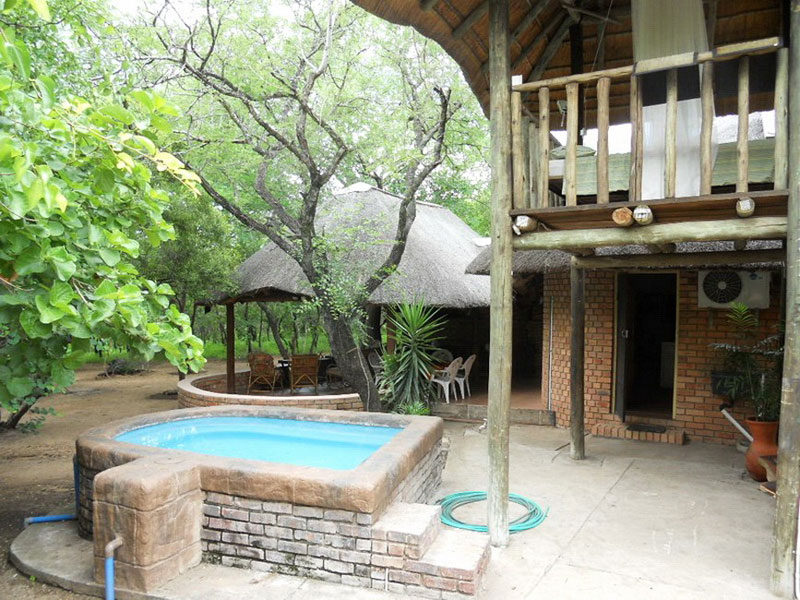 Baby Lodge has an open plan lounge/bedroom with a full bathroom with bath and shower. There are two three-quarter beds and a single bed. Baby Lodge has a fully equipped kitchen and a flat-screened DStv in the living area. (Please bring own decoder, cables, remote and smart card). There is a covered patio, a boma for a braai and campfire during the evenings. Guests can make use of a thatched carport and a splash pool to cool off during the hot days and nights (shared).