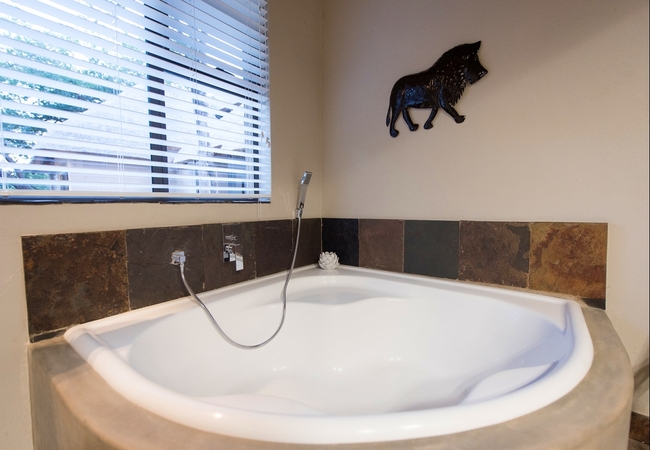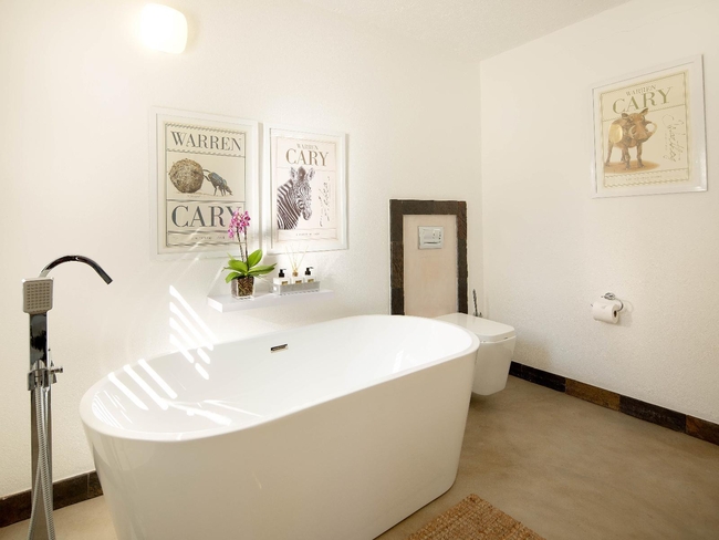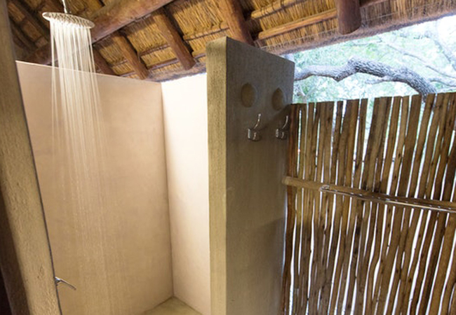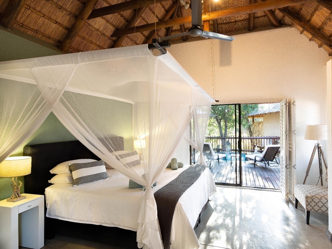 This luxurious chalet is furnished with a King-size extra length bed with mosquito net, fan and air-conditioning. The en-suite bathroom is fitted with a corner bath, double sink, toilet, outside shower and free toiletries. The chalet ha a thatch room, a private veranda and a beautiful view of the garden.