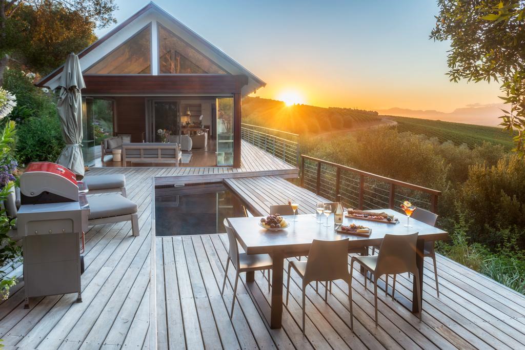 This luxury Stellenbosch Accommodation consists of the main house and the cottage, sleeping a group of six guests in total. The main lodge houses the open plan living, dining and kitchen area as well as the main bedroom with an en-suite bathroom. It is separated from the two bedroom cottage by a landscaped deck and pool area overlooking the spectacular west-facing views over the vineyards, valley and Table Mountain.