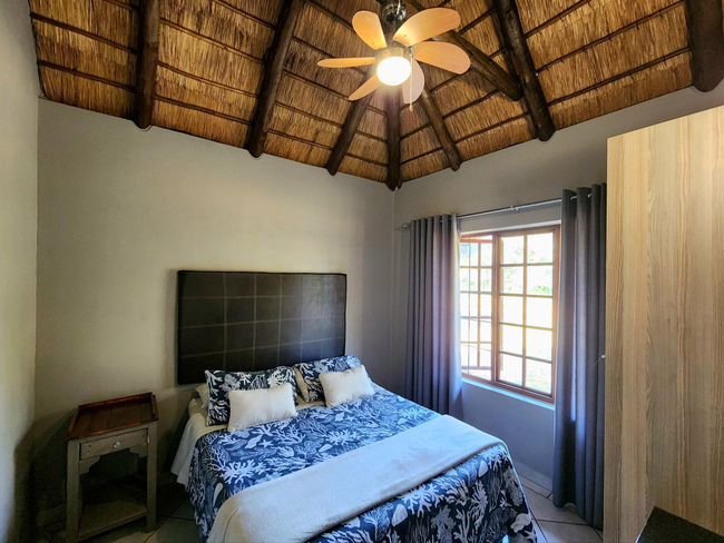 Two bedroom thatched chalet, one bedroom with queen size bed the other has 2 x single beds, beautiful shower bathroom, exclusive fully equiped kitchen, 2 sleeper couches in lounge, comfortable braai facilities