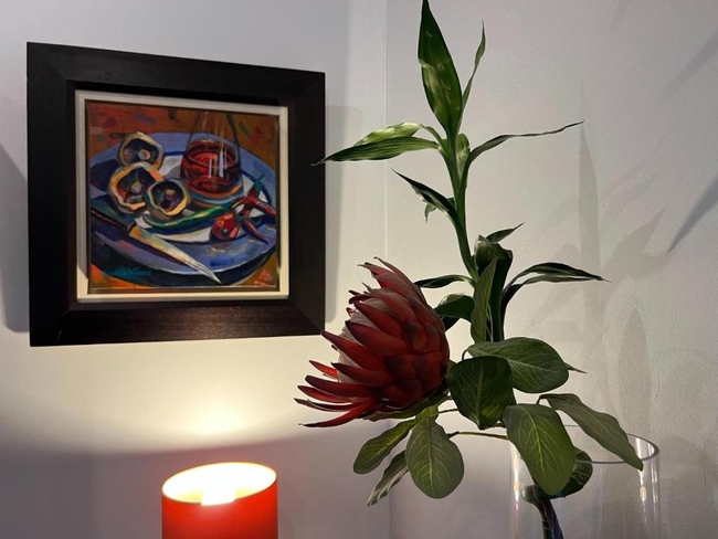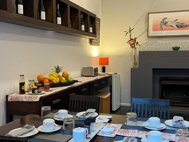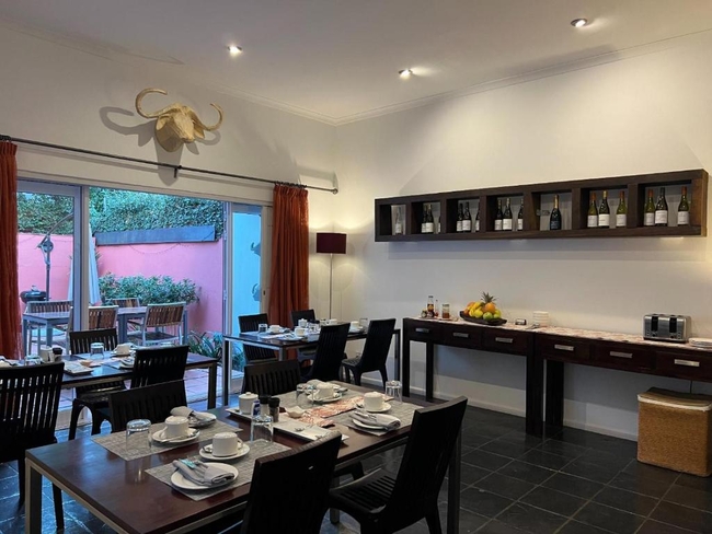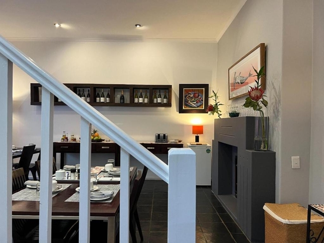 English or continental breakfast is served in the diningroom or the peaceful courtyard. In the diningroom, which leads out through french doors to the courtyard, we exhibit up and coming South African artists whose pictures are for sale.