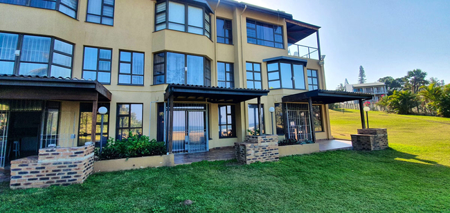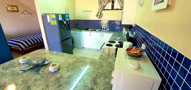 Sliding glass doors in the lounge open onto the veranda, which includes a braai facility and a spacious grass area for children to play, all with direct access to the beach. A single garage is available, and the apartment is secured with an alarm and a small safe for valuables.