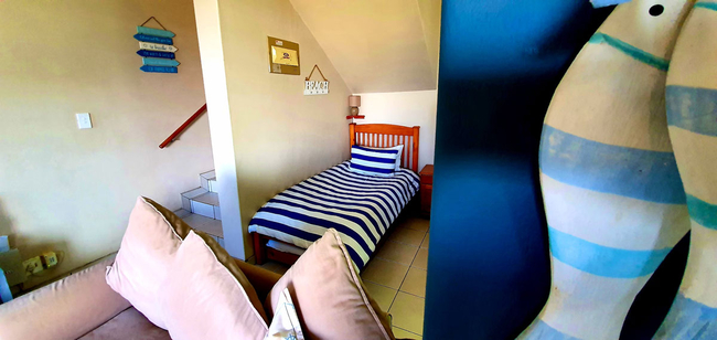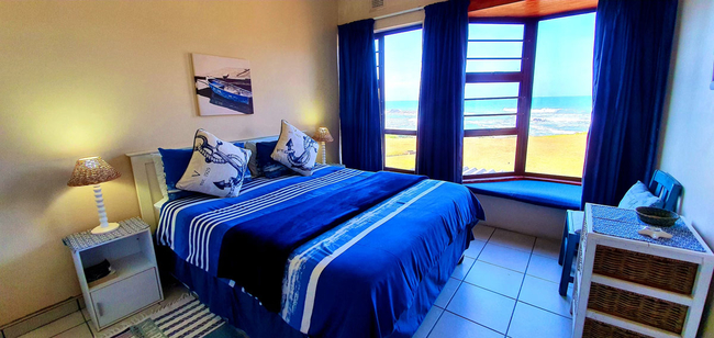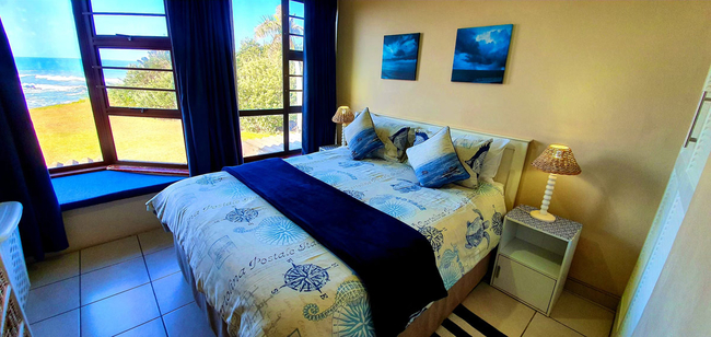 Calamari 10 is a beachfront holiday apartment on a pristine stretch of Ramsgate North beach, providing sweeping views of the breakers and the sea. From the veranda, guests can step directly onto the sand, a mere 30 metres from the apartment. The duplex accommodates six guests and features two upstairs bedrooms, each furnished with a queen-size bed. Additionally, there is a sleeping area off the lounge with a single bed and a sliding single bed beneath. All bedrooms and the lounge offer remarkable sea views and are fitted with ceiling fans. The apartment includes two bathrooms, one en-suite with a bath, and a second with a shower, as well as a separate guest toilet. The open-plan kitchen is fully equipped with a stove, oven, fridge-freezer, microwave, and dishwasher, allowing for all your self-catering needs. The lounge is furnished with a TV featuring a full DStv package and a DVD player, eliminating the need to bring a personal decoder. Unlimited Wi-Fi and Netflix are provided, while a UPS system ensures uninterrupted power for entertainment and connectivity during load shedding. Sliding glass doors in the lounge open onto the veranda, which includes a braai facility and a spacious grass area for children to play, all with direct access to the beach. A single garage is available, and the apartment is secured with an alarm and a small safe for valuables. The unit is not serviced during your stay, though cleaning services can be arranged at an additional fee. All linen and towels are supplied, however guests should bring their own beach towels. A washing machine and thermal clothes dryer are also provided for convenience.