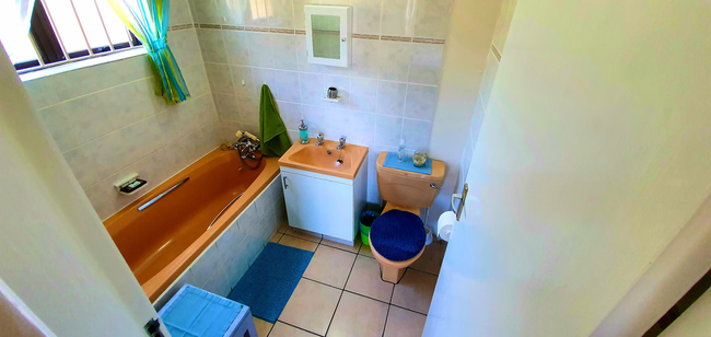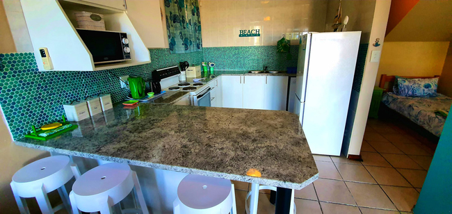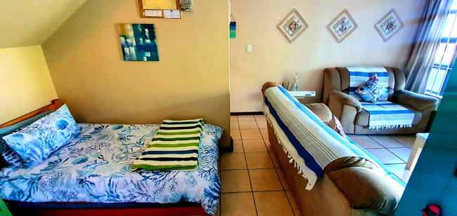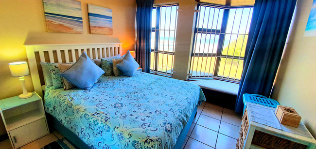 This spacious duplex accommodates up to 6 guests. Upstairs are two bedrooms, each furnished with a queen-size bed, while the downstairs lounge area features an additional sleeping space with a single bed and a pull-out bed beneath. The main bedroom and lounge are equipped with air-conditioning, while the second bedroom is fitted with a ceiling fan, ensuring comfort throughout the year. Both bedrooms and the lounge offer uninterrupted sea views. The apartment includes two bathrooms: one en-suite with a bath, and the other fitted with a shower and washing machine, along with a separate guest toilet for added convenience. Please note that air-conditioning operates on a prepaid meter, which guests are responsible for topping up if used. The open-plan kitchen is fully equipped for self-catering and features a stove, oven, microwave, fridge-freezer, dishwasher, and thermal clothes dryer. A breakfast bar with stools provides a casual dining space. The lounge area offers ample seating for six, along with a flat-screen TV, premium Explora DStv, a DVD player, and unlimited fibre WiFi with Netflix access. A UPS system has been installed to ensure uninterrupted viewing and connectivity during loadshedding. Sliding doors open from the lounge onto a patio furnished for outdoor relaxation. Guests can enjoy the built-in braai and the expansive grassed area, which is perfect for children to play. The unit includes a single garage, and for peace of mind, it is fitted with both an alarm system and a safe for valuables. While the apartment is not serviced, housekeeping can be arranged at an additional cost. All linen and towels are provided, but guests are kindly asked to bring their own beach towels.