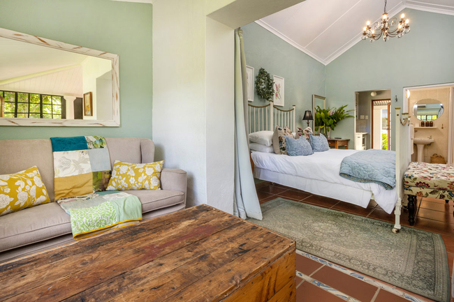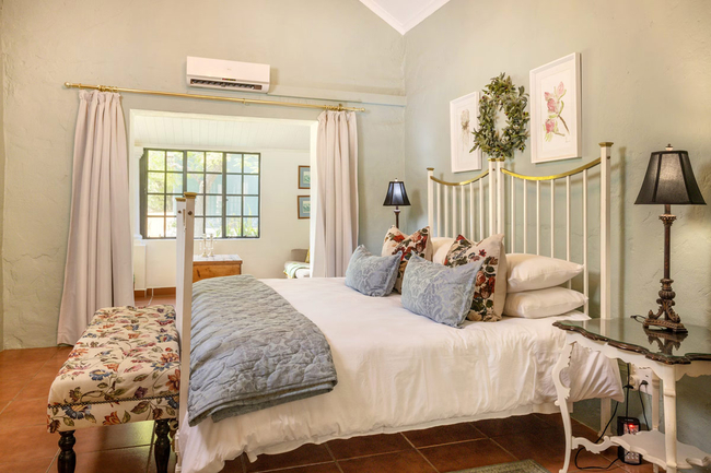 The Mountain View room has a luxurious king-size bed with a beautiful view of the Klein Swartberg Mountains and the Caledon Grace gardens. The room is located on the first floor of the main manor house. Caledon Grace Guest House rooms include a hair dryer, Wi-Fi, a fan, tea tray and electric blanket.