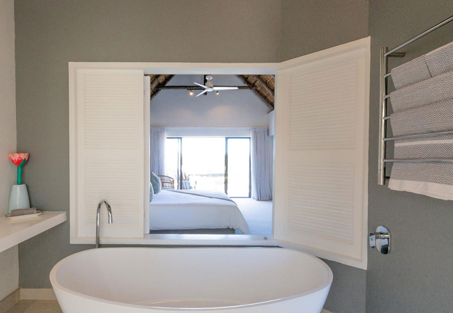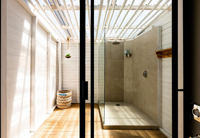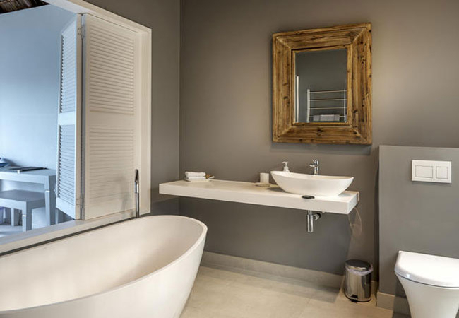 Canal Room – Twin is furnished with twin beds and has an en-suite bathroom fitted with a bath, toilet and basin. There is also a covered outdoor shower. Shutters open up the bathroom to the bedroom. Each room has Wi-Fi, a smart TV with satellite channels and Netflix, safe, fan, desk heater, hairdryer, fridge and tea / coffee making facilities.