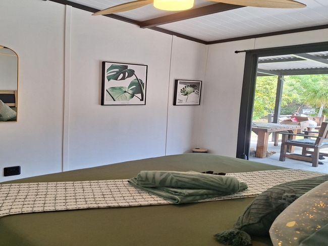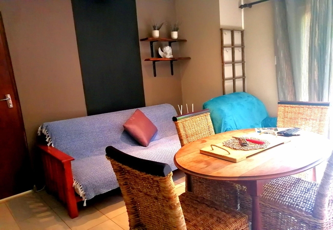 Timber log home with one bedroom with double bed and bunk beds in open plan. Fully equipped and bedding provided. Air conditioner. DSTV commercial package. Braai facilities on the deck overlooking the beautiful garden and magnificent river running through.