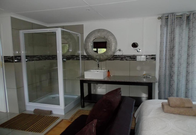 This Honeymoon Cabin has a veranda with a view of our spectacular farm and river. The cabin is furnished with a King-size bed and a sleeper couch. The en-suite bathroom fitted with bath, toilet and basin. The room is equipped with air-con, coffee and tea facilities, fridge and a TV with satellite channels.
