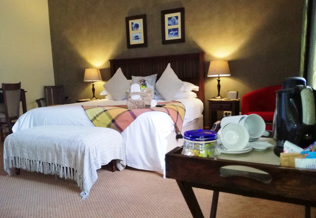 Luxury Twin Rooms are situated in the main building and equipped with a TV and DSTV decoders, minibar, air conditioning unit, underfloor heating and/or a ceiling fan. Furnished with twin beds, there is also a complimentary tea and coffee service tray in the room. Rooms are air-conditioned with overhead fans and are non-smoking, have the necessary quality linens, plush robes, electronic safes, hairdryers, telephones, wireless internet connectivity, underfloor heating and satellite TV channels.