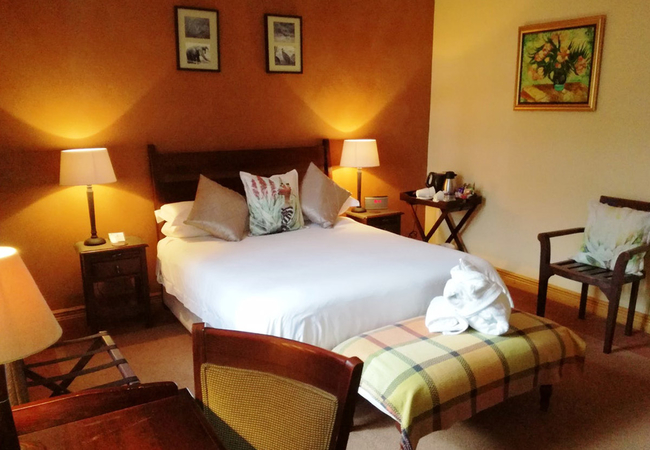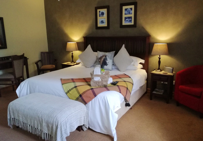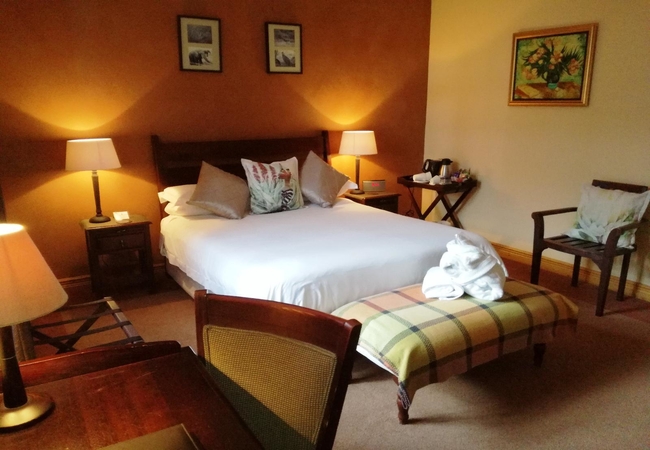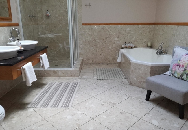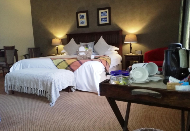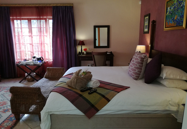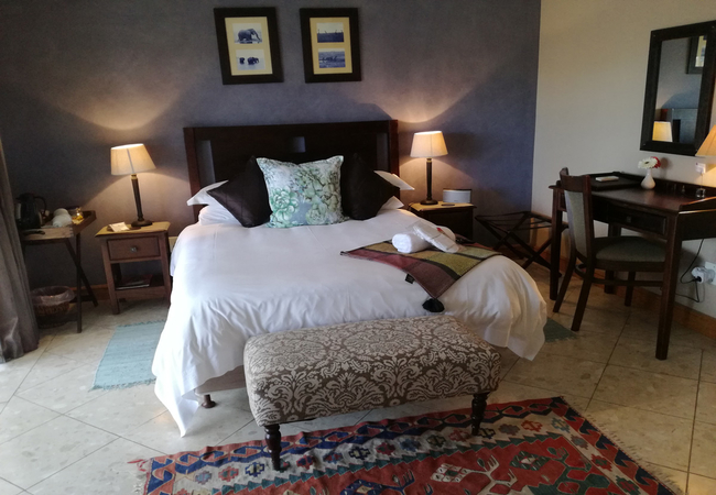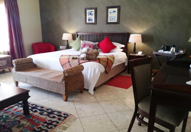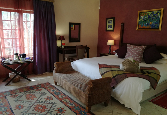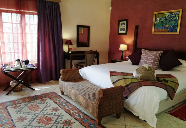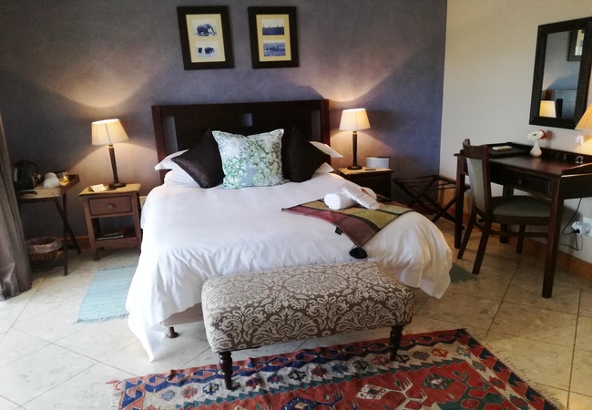 Luxury rooms are situated in the main building. Furnished with a luxury Queen-size bed, the rooms are equipped with a TV and DStv decoders, minibar, air-conditioning unit, underfloor heating and/or a ceiling fan. En-suite bathroom fitted with a bath, shower, hand basin and WC and there is also a complimentary tea and coffee service tray in the room.