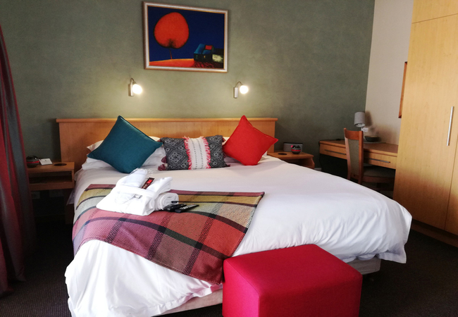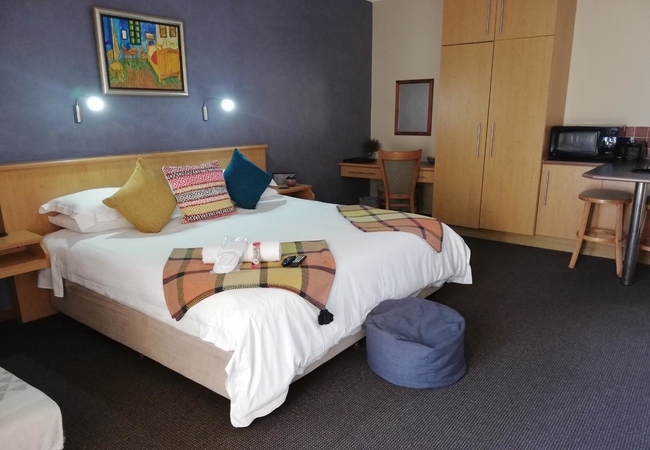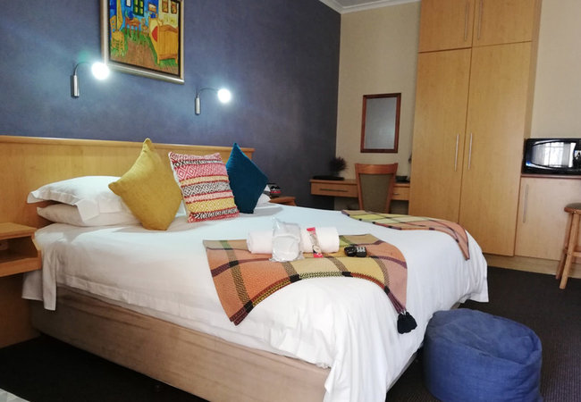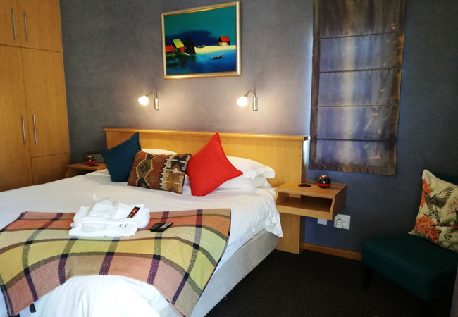 Our Executive Room is generously proportioned, offering Minibar, TV and DSTV decoder, underfloor heating, airconditioning unit and ceiling fan. The room also offers generous seating to accommodate visiting guests / families. Rooms are air-conditioned with overhead fans and are non-smoking, have the necessary quality linens, plush robes, electronic safes, hairdryers, telephones, wireless internet connectivity, underfloor heating and satellite TV channels.