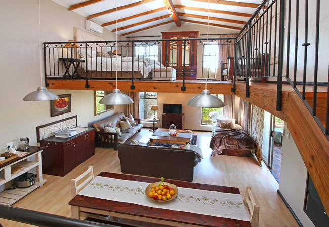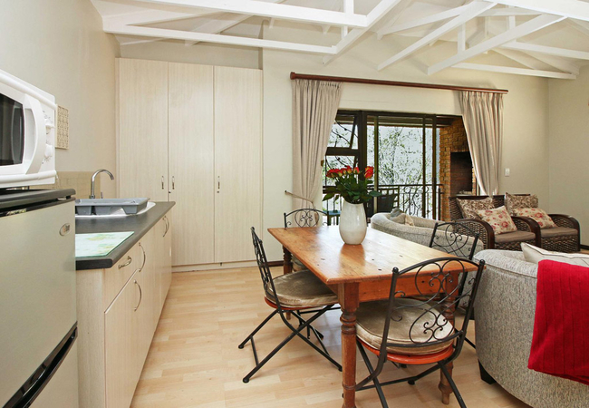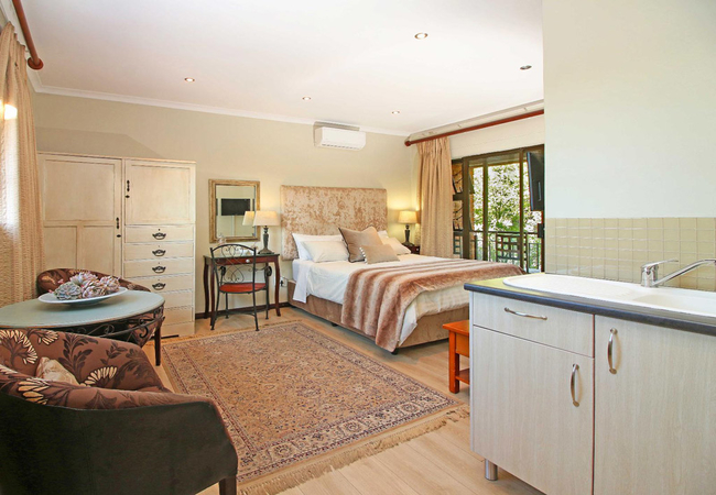 Beautifully appointed open plan self catering unit with a Queen-size bed, romantic bathroom with a shower and bath, comfortable seating for two and a dining table. There is a private entrance, balcony with kettle braai. TV with Satellite Channels is provided. The kitchenette has a fridge, microwave, frying pan and a small stove on request.