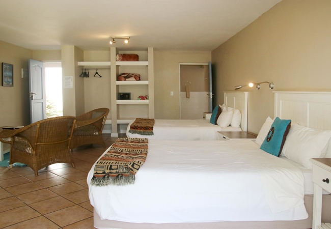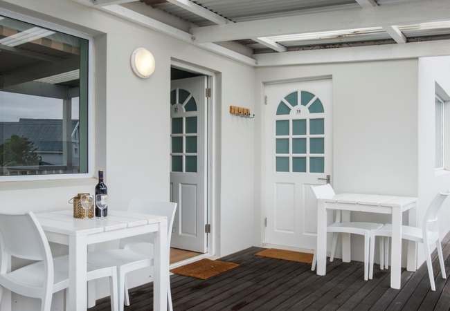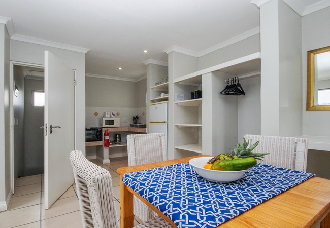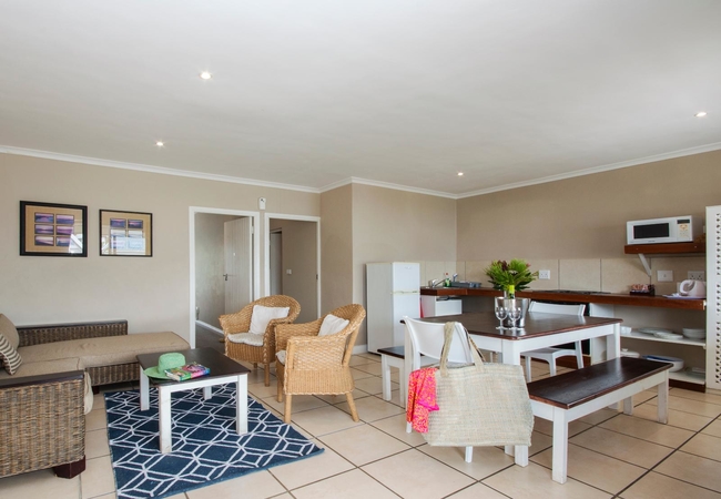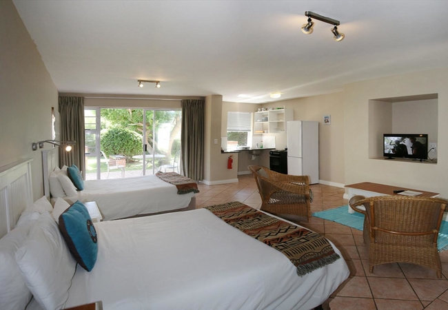 All the generous bedrooms in these apartments have their own doors leading outside and are en-suite, each with spacious showers and some with shower and separate bath. The bedrooms lead into the roomy lounge/dining area where you will find a compact yet generous kitchen kitted out with all the necessary bits and pieces. Each unit is furnished with a double bed in one room and two twin beds in the other. Well positioned to take advantage of sunny days. These apartments are great for families or even two couples who are holidaying together.