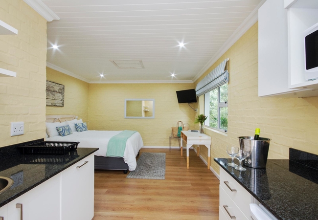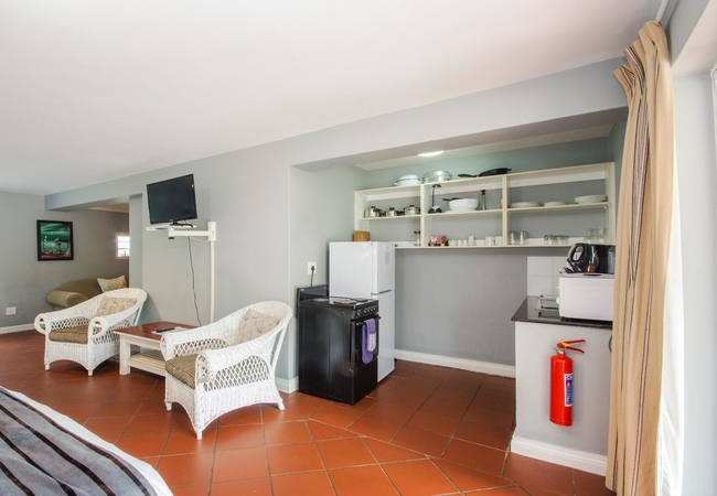 These Standard Double Rooms are open plan double rooms which are furnished with a double bed. The rooms have a seating area, and there is a kitchenette suitable for light self-catering. The en-suite bathrooms are equipped with shower only. Facilities include TV, tea and coffee making facility. Limited room service, a la Carte restaurant on site, communal swimming pool.
