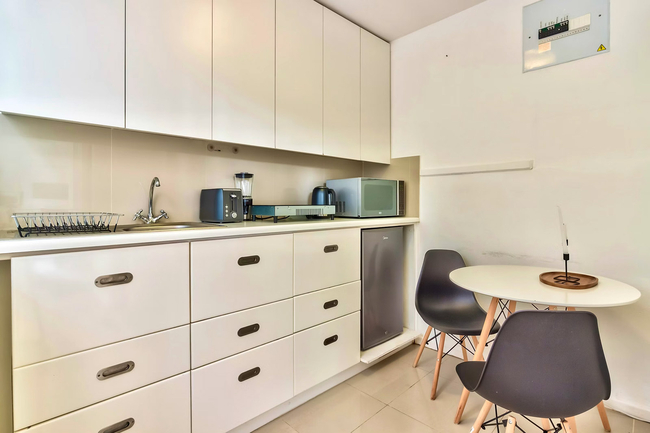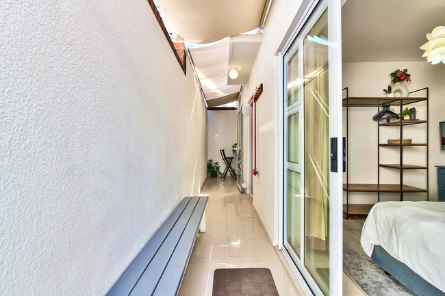 This thoughtfully designed studio apartment accommodates up to two guests and comprises a comfortable bedroom and a well-appointed bathroom. The bedroom is furnished with a double bed, while the bathroom features a bath with a shower overhead, along with a washbasin and toilet. Quality linen and bath towels are provided for guests’ convenience.