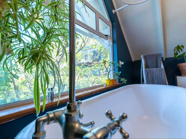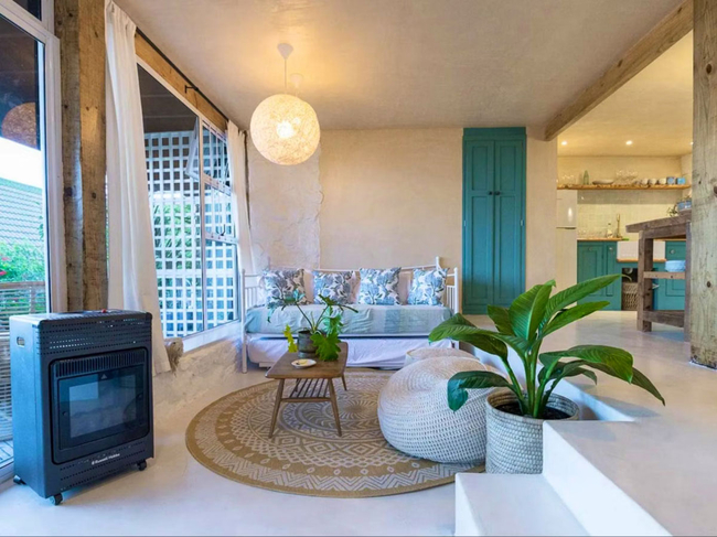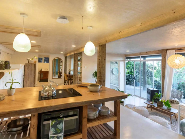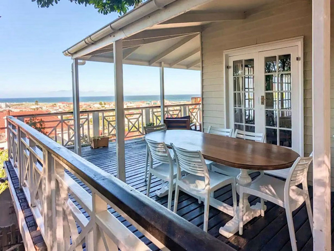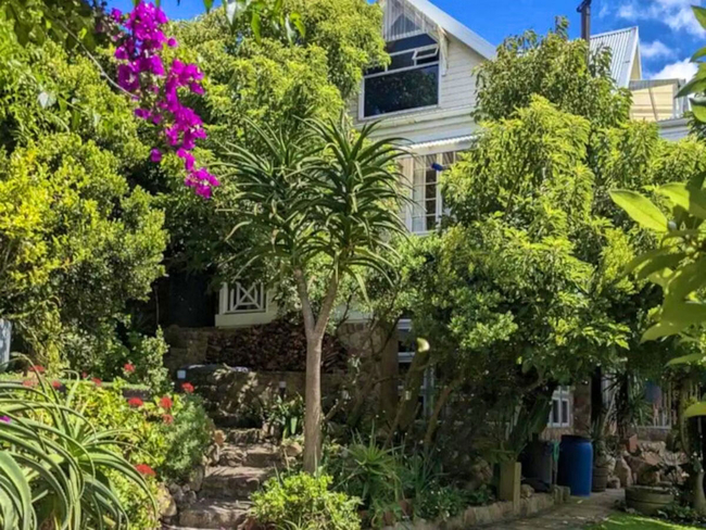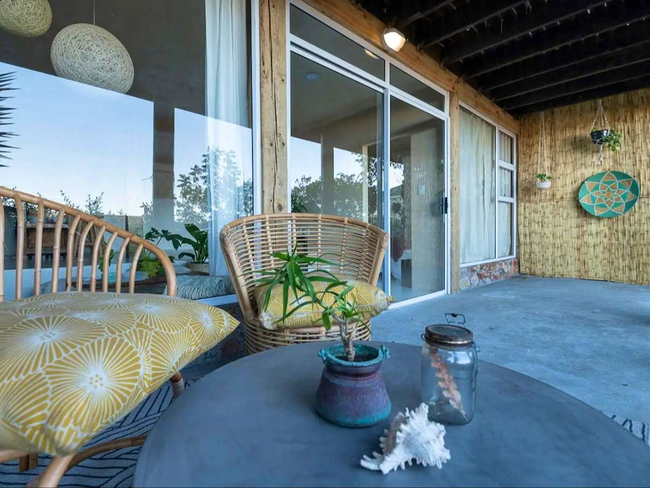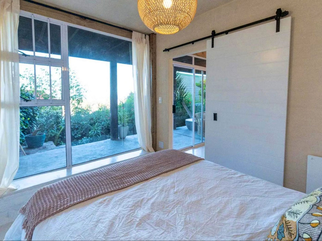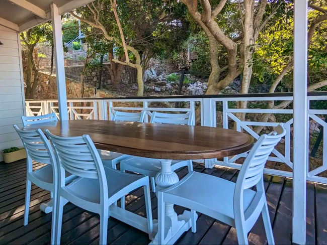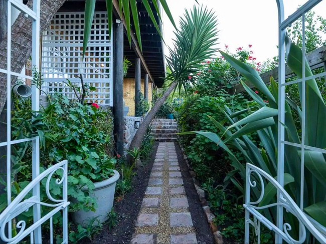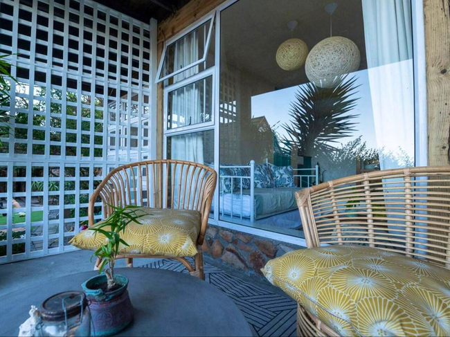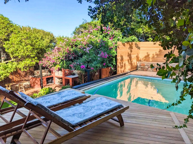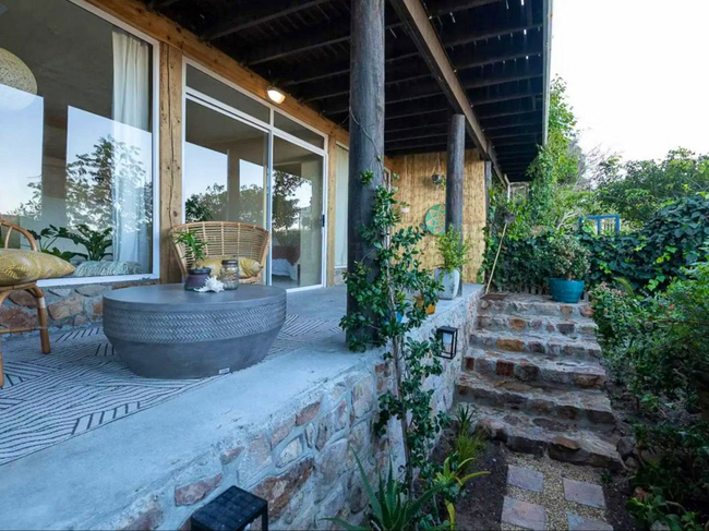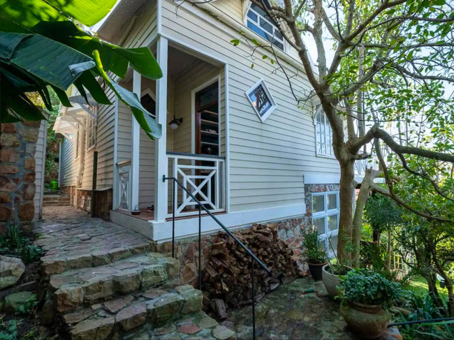 The charming wooden house is situated above a verdant indigenous garden, providing ample space for relaxation.