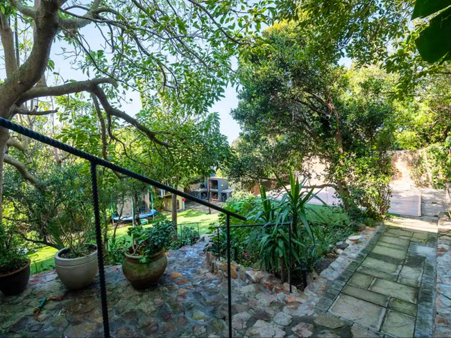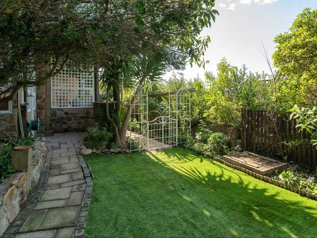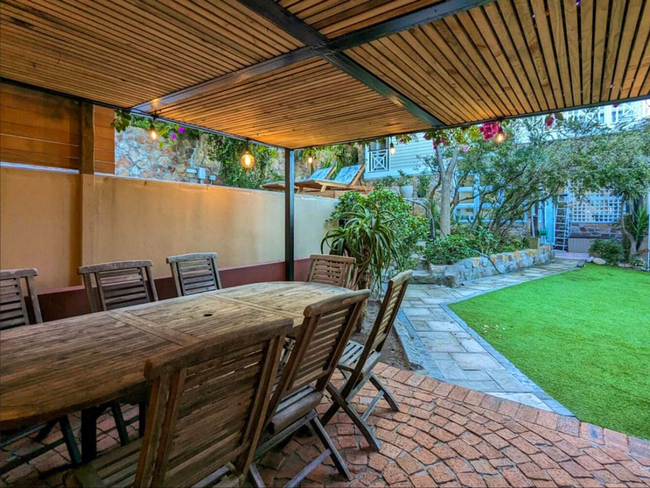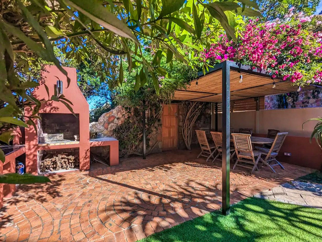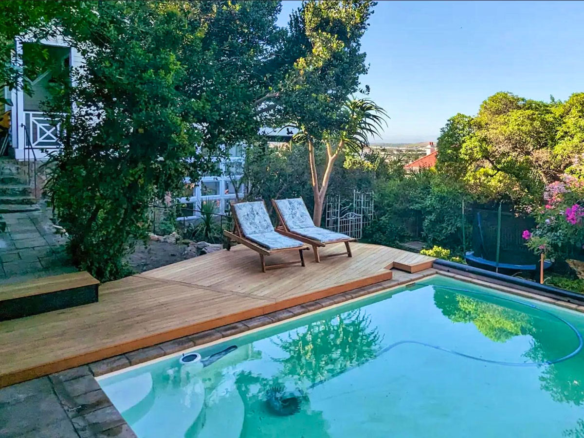 The upper level of the garden boasts a tranquil saltwater pool, perfect for cooling off on warm days. The lower level includes a braai area and a pizza oven, with a dining table set beneath a grand bougainvillaea.