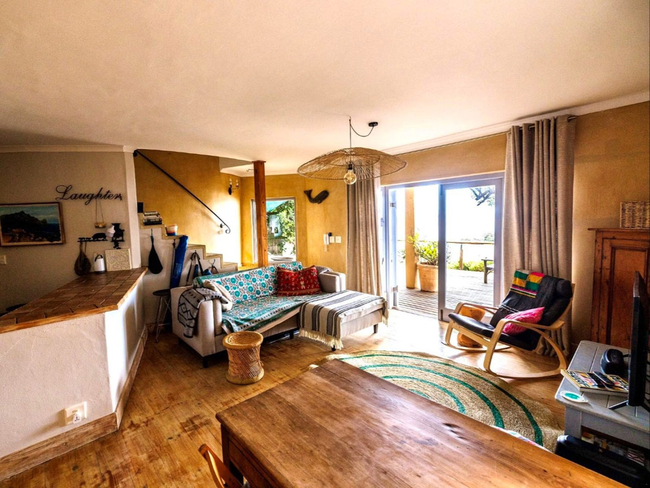 This thoughtfully designed cottage features one tastefully furnished bedroom, fitted with a queen-size bed. The en-suite bathroom is equipped with a shower, a toilet, and a washbasin, providing comfort and practicality. The open-concept kitchen is designed to meet the needs of guests wishing to self-cater. It includes a gas hob, electric oven, refrigerator, microwave, toaster, and kettle, along with a full set of crockery and cutlery. Tea and coffee essentials are also provided to ensure a convenient and comfortable stay. The kitchen flows into a cosy living area, which is appointed with a plush sofa and a daybed that can accommodate an additional guest. Other amenities include a flat-screen television with Netflix, a writing desk for those needing a quiet corner to work or reflect, and high-speed Wi-Fi available at no extra charge. Expansive sliding glass doors lead out to a broad timber deck that enjoys partial shade from a retractable awning. This outdoor space features a comfortable seating area, a dining table ideal for alfresco meals, and a Weber braai. The panoramic sea views from the deck create a spectacular backdrop for sunset dinners and restful afternoons spent outdoors.