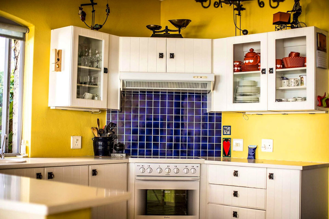 The kitchen, rich in colour and character, includes a fridge, oven with stove, and microwave. It flows seamlessly into an open-plan lounge and dining area, creating an ideal space for relaxation and entertaining. The home is thoughtfully adorned with an eclectic mix of books, collectables, CDs, art, and artefacts, reflecting a distinct personality. Modern amenities include complimentary Wi-Fi and a Smart TV with access to Netflix for added comfort and convenience.