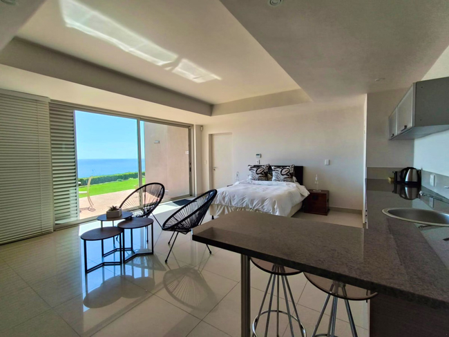This open-plan unit opens onto a patio, offering a breathtaking view of the ocean. Inside, it features a king-size bed, a TV equipped with streaming services, and a kitchenette complete with a microwave and tea and coffee-making facilities. The en-suite bathroom includes a shower, and Wi-Fi is readily available. The unit provides a wide range of amenities for your comfort and convenience. It includes Wi-Fi, a sitting area, and a TV with DSTV or satellite channels. Guests can enjoy Netflix and a variety of views, including the ocean, garden, and city. The non-smoking unit also features outdoor furniture on the patio, along with access to a garden.